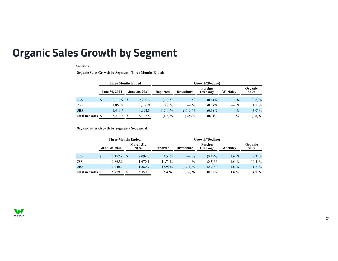 21 Organic Sales Growth by Segment $ millions Organic Sales Growth by Segment - Three Months Ended: Three Months Ended Growth/(Decline) June 30, 2024 June 30, 2023 Reported Divestiture Foreign Exchange Workday Organic Sales EES $ 2,172.9 $ 2,200.3 (1.2) % — % (0.6) % — % (0.6) % CSS 1,865.9 1,850.9 0.8 % — % (0.3) % — % 1.1 % UBS 1,440.9 1,694.3 (15.0) % (11.9) % (0.1) % — % (3.0) % Total net sales $ 5,479.7 $ 5,745.5 (4.6) % (3.5) % (0.3) % — % (0.8) % Organic Sales Growth by Segment - Sequential: Three Months Ended Growth/(Decline) June 30, 2024 March 31, 2024 Reported Divestiture Foreign Exchange Workday Organic Sales EES $ 2,172.9 $ 2,099.0 3.5 % — % (0.4) % 1.6 % 2.3 % CSS 1,865.9 1,670.1 11.7 % — % (0.3) % 1.6 % 10.4 % UBS 1,440.9 1,580.9 (8.9) % (12.1) % (0.2) % 1.6 % 1.8 % Total net sales $ 5,479.7 $ 5,350.0 2.4 % (3.6) % (0.3) % 1.6 % 4.7 %