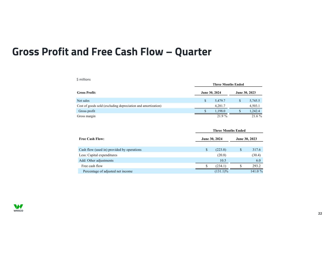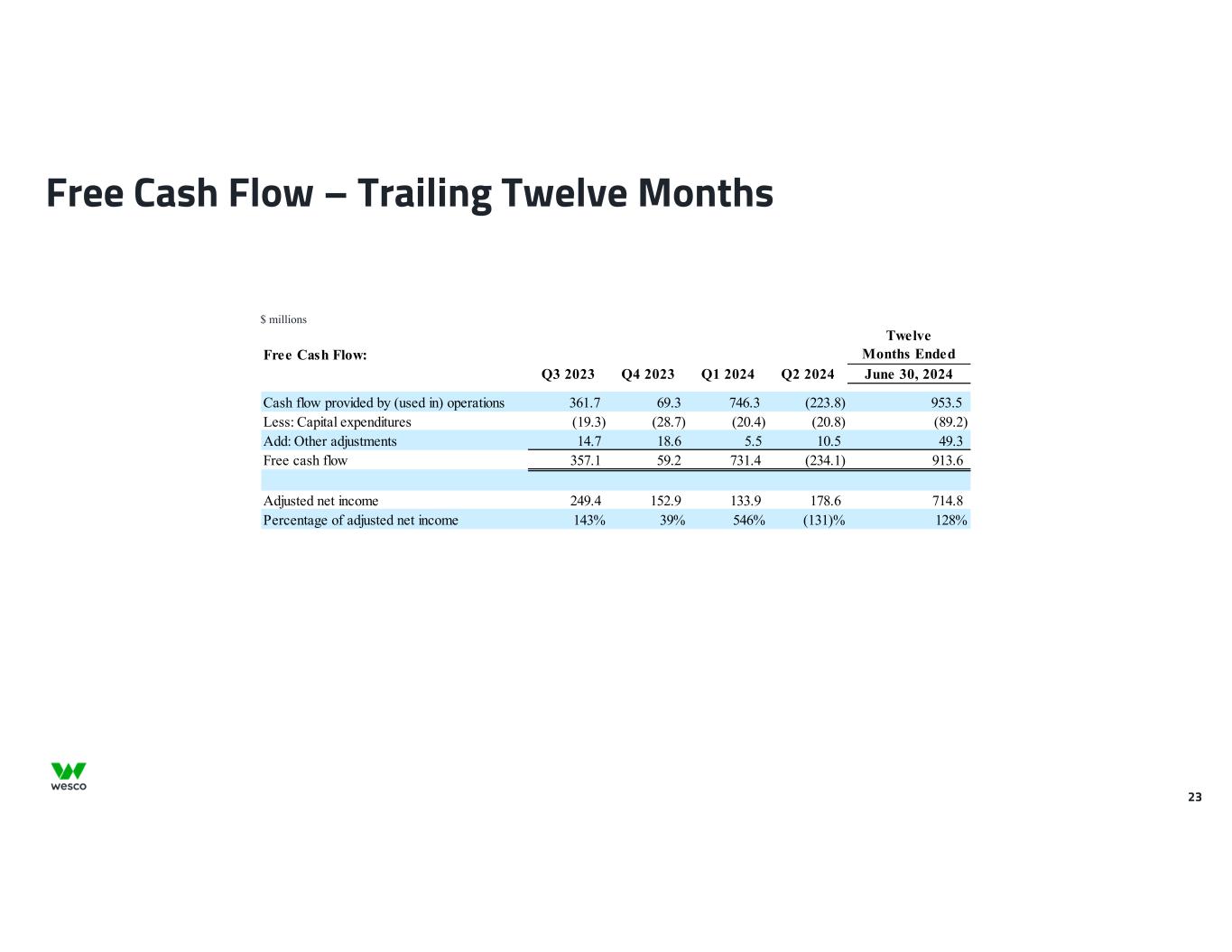 22 Gross Profit and Free Cash Flow – Quarter $ millions Three Months Ended Gross Profit: June 30, 2024 June 30, 2023 Net sales $ 5,479.7 $ 5,745.5 Cost of goods sold (excluding depreciation and amortization) 4,281.7 4,503.1 Gross profit $ 1,198.0 $ 1,242.4 Gross margin 21.9 % 21.6 % Three Months Ended Free Cash Flow: June 30, 2024 June 30, 2023 Cash flow (used in) provided by operations $ (223.8) $ 317.6 Less: Capital expenditures (20.8) (30.4) Add: Other adjustments 10.5 6.0 Free cash flow $ (234.1) $ 293.2 Percentage of adjusted net income (131.1) % 141.0 %