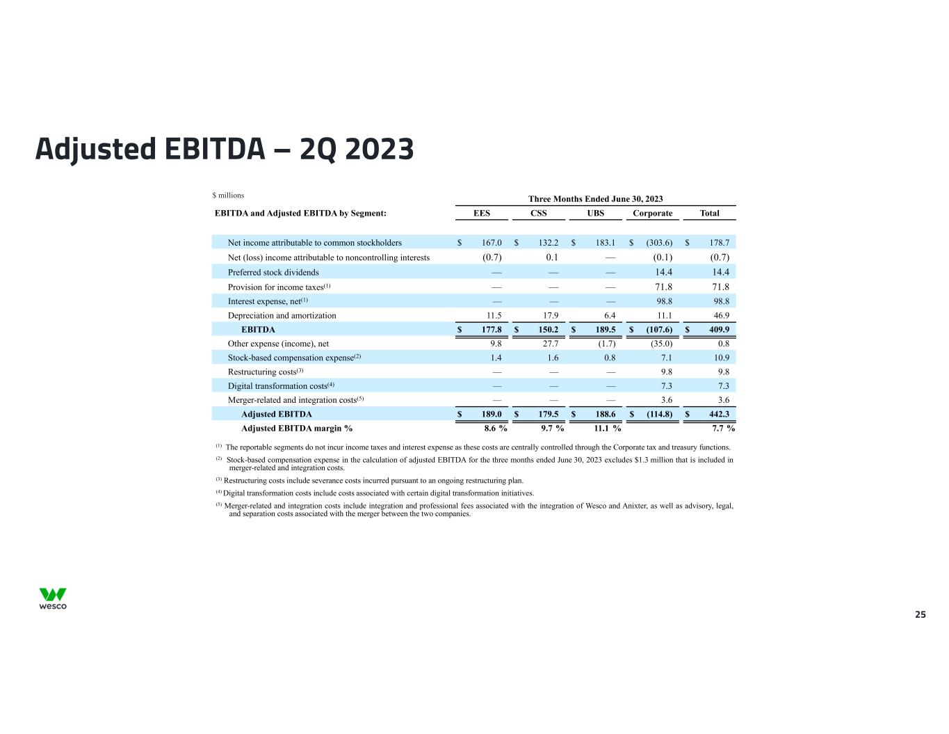 24 Three Months Ended June 30, 2024 EBITDA and Adjusted EBITDA by Segment: EES CSS UBS Corporate Total Net income attributable to common stockholders $ 179.3 $ 114.3 $ 268.5 $ (344.4) $ 217.7 Net income (loss) attributable to noncontrolling interests 0.1 0.7 — (0.1) 0.7 Preferred stock dividends — — — 14.4 14.4 Provision for income taxes(1) — — — 87.8 87.8 Interest expense, net(1) — — — 98.8 98.8 Depreciation and amortization 11.4 18.2 7.4 9.1 46.1 EBITDA $ 190.8 $ 133.2 $ 275.9 $ (134.4) $ 465.5 Other expense (income), net 3.0 16.0 (103.2) (11.7) (95.9) Stock-based compensation expense 1.1 1.6 0.8 (0.8) 2.7 Loss on abandonment of assets(2) — — — 17.8 17.8 Digital transformation costs(3) — — — 6.1 6.1 Cloud computing arrangement amortization(4) — — — 3.0 3.0 Restructuring costs(5) — — — 0.9 0.9 Adjusted EBITDA $ 194.9 $ 150.8 $ 173.5 $ (119.1) $ 400.1 Adjusted EBITDA margin % 9.0 % 8.1 % 12.0 % 7.3 % Adjusted EBITDA – 2Q 2024 $ millions (1) The reportable segments do not incur income taxes and interest expense as these costs are centrally controlled through the Corporate tax and treasury functions.  (2) Loss on abandonment of assets represents the write-off of certain capitalized cloud computing arrangement implementation costs relating to a third-party developed operations management software product in favor of an application with functionality that better suits the Company’s operations. (3) Digital transformation costs include costs associated with certain digital transformation initiatives. (4) Cloud computing arrangement amortization consists of expense recognized in selling, general and administrative expenses for capitalized implementation costs for cloud computing arrangements to support our digital transformation initiatives. (5) Restructuring costs include severance costs incurred pursuant to an ongoing restructuring plan.