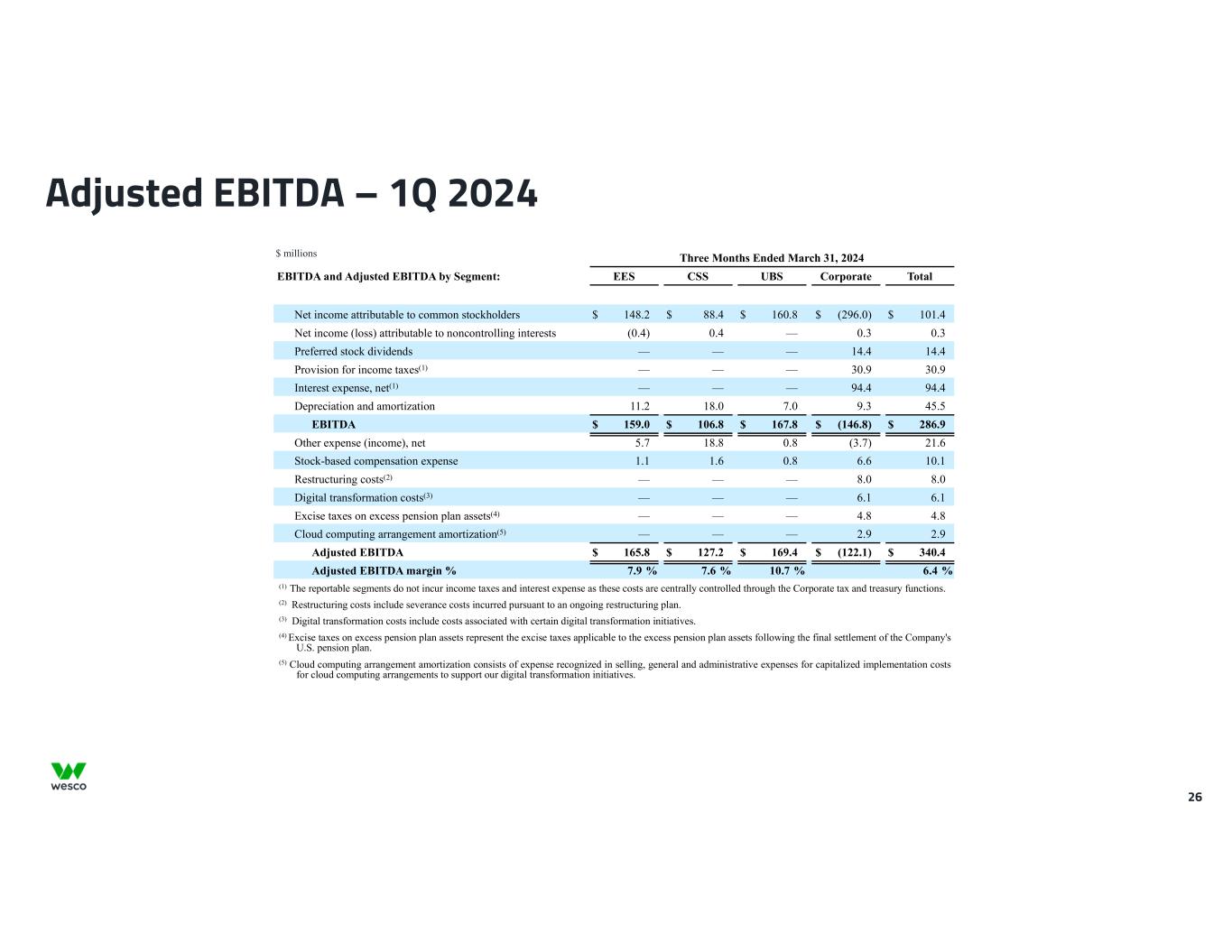 25 Adjusted EBITDA – 2Q 2023 Three Months Ended June 30, 2023 EBITDA and Adjusted EBITDA by Segment: EES CSS UBS Corporate Total Net income attributable to common stockholders $ 167.0 $ 132.2 $ 183.1 $ (303.6) $ 178.7 Net (loss) income attributable to noncontrolling interests (0.7) 0.1 — (0.1) (0.7) Preferred stock dividends — — — 14.4 14.4 Provision for income taxes(1) — — — 71.8 71.8 Interest expense, net(1) — — — 98.8 98.8 Depreciation and amortization 11.5 17.9 6.4 11.1 46.9 EBITDA $ 177.8 $ 150.2 $ 189.5 $ (107.6) $ 409.9 Other expense (income), net 9.8 27.7 (1.7) (35.0) 0.8 Stock-based compensation expense(2) 1.4 1.6 0.8 7.1 10.9 Restructuring costs(3) — — — 9.8 9.8 Digital transformation costs(4) — — — 7.3 7.3 Merger-related and integration costs(5) — — — 3.6 3.6 Adjusted EBITDA $ 189.0 $ 179.5 $ 188.6 $ (114.8) $ 442.3 Adjusted EBITDA margin % 8.6 % 9.7 % 11.1 % 7.7 % (1) The reportable segments do not incur income taxes and interest expense as these costs are centrally controlled through the Corporate tax and treasury functions.  (2) Stock-based compensation expense in the calculation of adjusted EBITDA for the three months ended June 30, 2023 excludes $1.3 million that is included in merger-related and integration costs.  (3) Restructuring costs include severance costs incurred pursuant to an ongoing restructuring plan.  (4) Digital transformation costs include costs associated with certain digital transformation initiatives.  (5) Merger-related and integration costs include integration and professional fees associated with the integration of Wesco and Anixter, as well as advisory, legal, and separation costs associated with the merger between the two companies.  $ millions