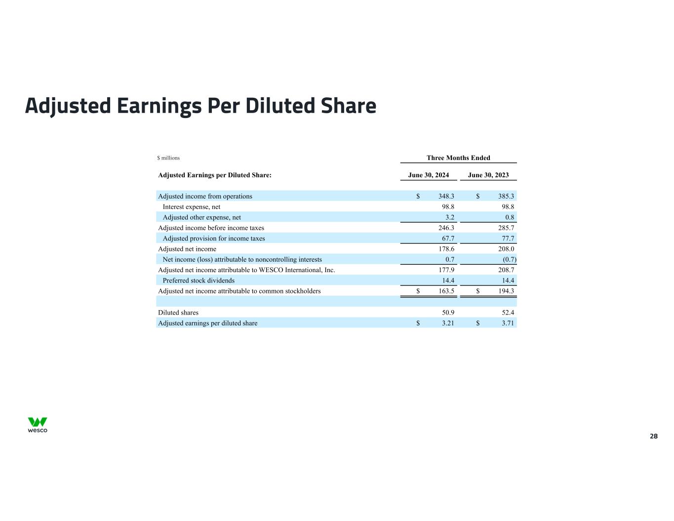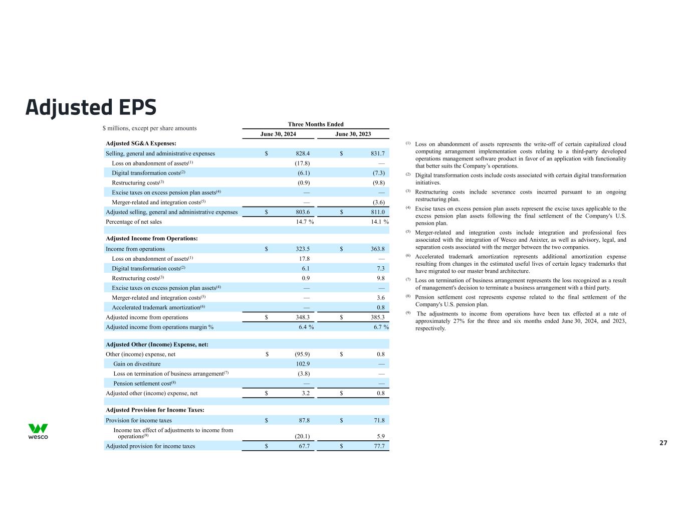 27 $ millions, except per share amounts Adjusted EPS Three Months Ended June 30, 2024 June 30, 2023 Adjusted SG&A Expenses: Selling, general and administrative expenses $ 828.4 $ 831.7 Loss on abandonment of assets(1) (17.8) — Digital transformation costs(2) (6.1) (7.3) Restructuring costs(3) (0.9) (9.8) Excise taxes on excess pension plan assets(4) — — Merger-related and integration costs(5) — (3.6) Adjusted selling, general and administrative expenses $ 803.6 $ 811.0 Percentage of net sales 14.7 % 14.1 % Adjusted Income from Operations: Income from operations $ 323.5 $ 363.8 Loss on abandonment of assets(1) 17.8 — Digital transformation costs(2) 6.1 7.3 Restructuring costs(3) 0.9 9.8 Excise taxes on excess pension plan assets(4) — — Merger-related and integration costs(5) — 3.6 Accelerated trademark amortization(6) — 0.8 Adjusted income from operations $ 348.3 $ 385.3 Adjusted income from operations margin % 6.4 % 6.7 % Adjusted Other (Income) Expense, net: Other (income) expense, net $ (95.9) $ 0.8 Gain on divestiture 102.9 — Loss on termination of business arrangement(7) (3.8) — Pension settlement cost(8) — — Adjusted other (income) expense, net $ 3.2 $ 0.8 Adjusted Provision for Income Taxes: Provision for income taxes $ 87.8 $ 71.8 Income tax effect of adjustments to income from operations(9) (20.1) 5.9 Adjusted provision for income taxes $ 67.7 $ 77.7 (1) Loss on abandonment of assets represents the write-off of certain capitalized cloud computing arrangement implementation costs relating to a third-party developed operations management software product in favor of an application with functionality that better suits the Company’s operations. (2) Digital transformation costs include costs associated with certain digital transformation initiatives. (3) Restructuring costs include severance costs incurred pursuant to an ongoing restructuring plan. (4) Excise taxes on excess pension plan assets represent the excise taxes applicable to the excess pension plan assets following the final settlement of the Company's U.S. pension plan. (5) Merger-related and integration costs include integration and professional fees associated with the integration of Wesco and Anixter, as well as advisory, legal, and separation costs associated with the merger between the two companies. (6) Accelerated trademark amortization represents additional amortization expense resulting from changes in the estimated useful lives of certain legacy trademarks that have migrated to our master brand architecture. (7) Loss on termination of business arrangement represents the loss recognized as a result of management's decision to terminate a business arrangement with a third party. (8) Pension settlement cost represents expense related to the final settlement of the Company's U.S. pension plan. (9) The adjustments to income from operations have been tax effected at a rate of approximately 27% for the three and six months ended June 30, 2024, and 2023, respectively.