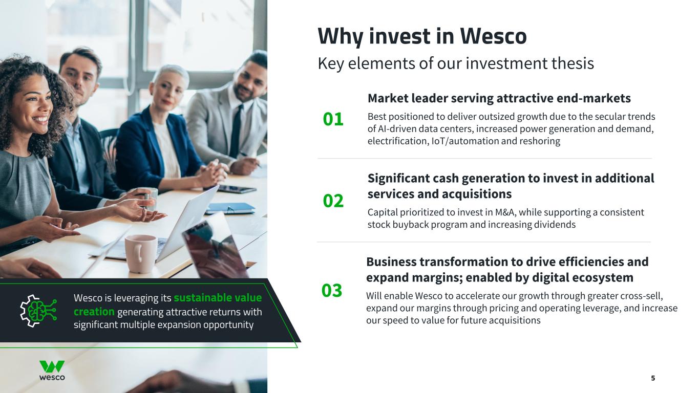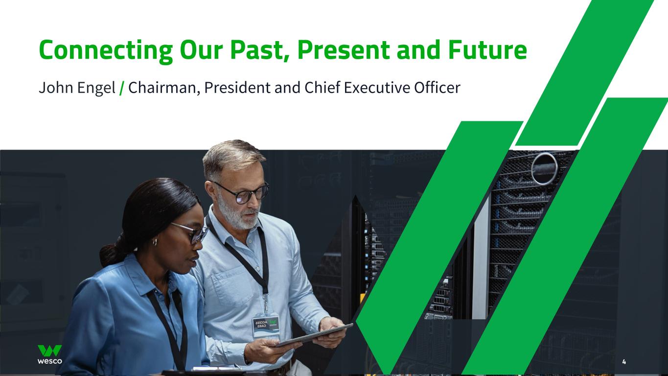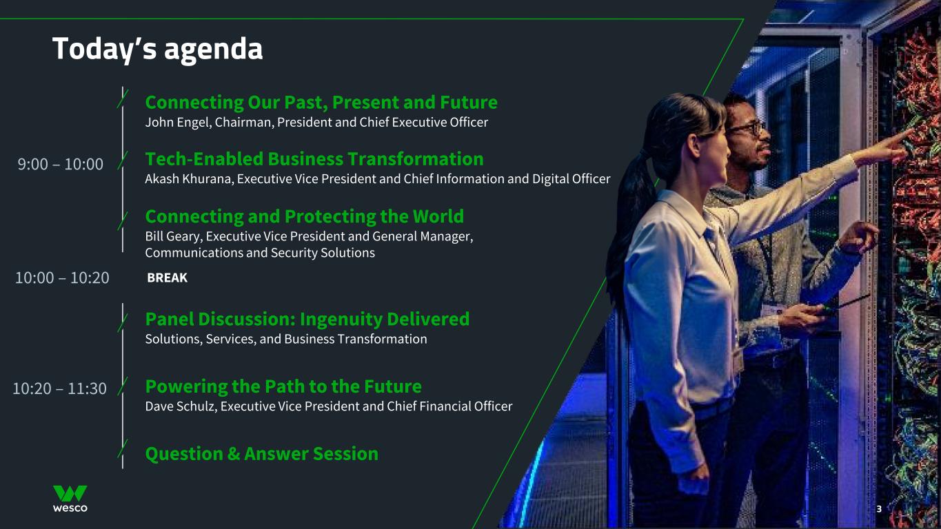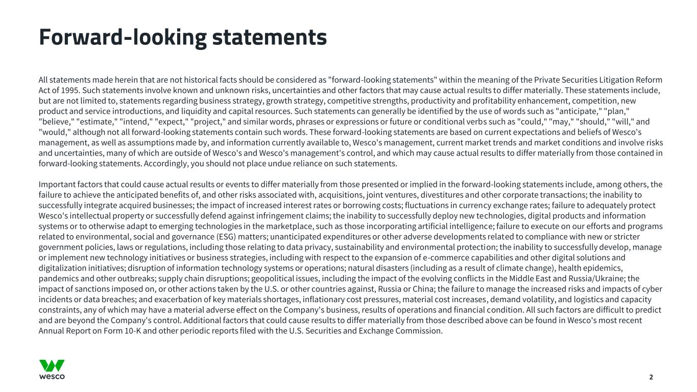 Forward-looking statements 2 All statements made herein that are not historical facts should be considered as "forward-looking statements" within the meaning of the Private Securities Litigation Reform Act of 1995. Such statements involve known and unknown risks, uncertainties and other factors that may cause actual results to differ materially. These statements include, but are not limited to, statements regarding business strategy, growth strategy, competitive strengths, productivity and profitability enhancement, competition, new product and service introductions, and liquidity and capital resources. Such statements can generally be identified by the use of words such as "anticipate," "plan," "believe," "estimate," "intend," "expect," "project," and similar words, phrases or expressions or future or conditional verbs such as "could," "may," "should," "will," and "would," although not all forward-looking statements contain such words. These forward-looking statements are based on current expectations and beliefs of Wesco's management, as well as assumptions made by, and information currently available to, Wesco's management, current market trends and market conditions and involve risks and uncertainties, many of which are outside of Wesco's and Wesco's management's control, and which may cause actual results to differ materially from those contained in forward-looking statements. Accordingly, you should not place undue reliance on such statements. Important factors that could cause actual results or events to differ materially from those presented or implied in the forward-looking statements include, among others, the failure to achieve the anticipated benefits of, and other risks associated with, acquisitions, joint ventures, divestitures and other corporate transactions; the inability to successfully integrate acquired businesses; the impact of increased interest rates or borrowing costs; fluctuations in currency exchange rates; failure to adequately protect Wesco's intellectual property or successfully defend against infringement claims; the inability to successfully deploy new technologies, digital products and information systems or to otherwise adapt to emerging technologies in the marketplace, such as those incorporating artificial intelligence; failure to execute on our efforts and programs related to environmental, social and governance (ESG) matters; unanticipated expenditures or other adverse developments related to compliance with new or stricter government policies, laws or regulations, including those relating to data privacy, sustainability and environmental protection; the inability to successfully develop, manage or implement new technology initiatives or business strategies, including with respect to the expansion of e-commerce capabilities and other digital solutions and digitalization initiatives; disruption of information technology systems or operations; natural disasters (including as a result of climate change), health epidemics, pandemics and other outbreaks; supply chain disruptions; geopolitical issues, including the impact of the evolving conflicts in the Middle East and Russia/Ukraine; the impact of sanctions imposed on, or other actions taken by the U.S. or other countries against, Russia or China; the failure to manage the increased risks and impacts of cyber incidents or data breaches; and exacerbation of key materials shortages, inflationary cost pressures, material cost increases, demand volatility, and logistics and capacity constraints, any of which may have a material adverse effect on the Company's business, results of operations and financial condition. All such factors are difficult to predict and are beyond the Company's control. Additional factors that could cause results to differ materially from those described above can be found in Wesco's most recent Annual Report on Form 10-K and other periodic reports filed with the U.S. Securities and Exchange Commission.