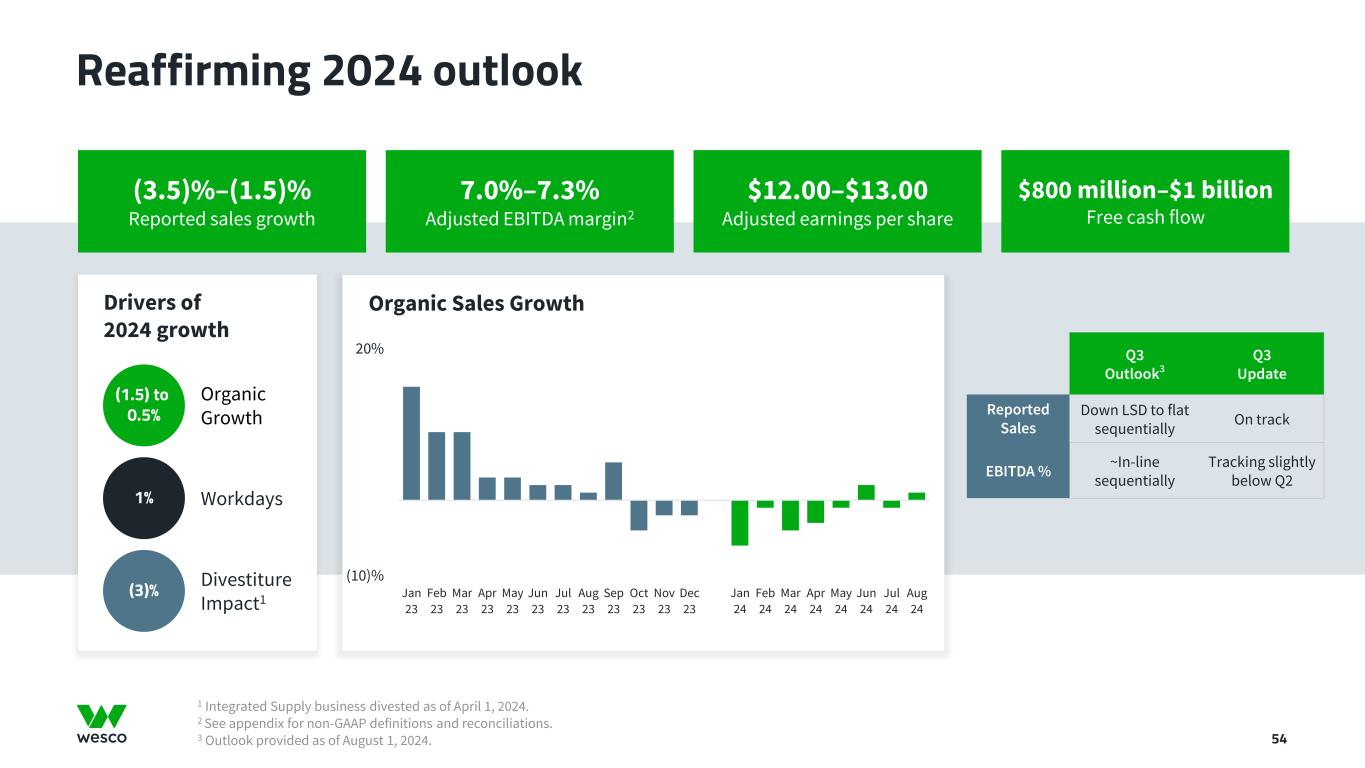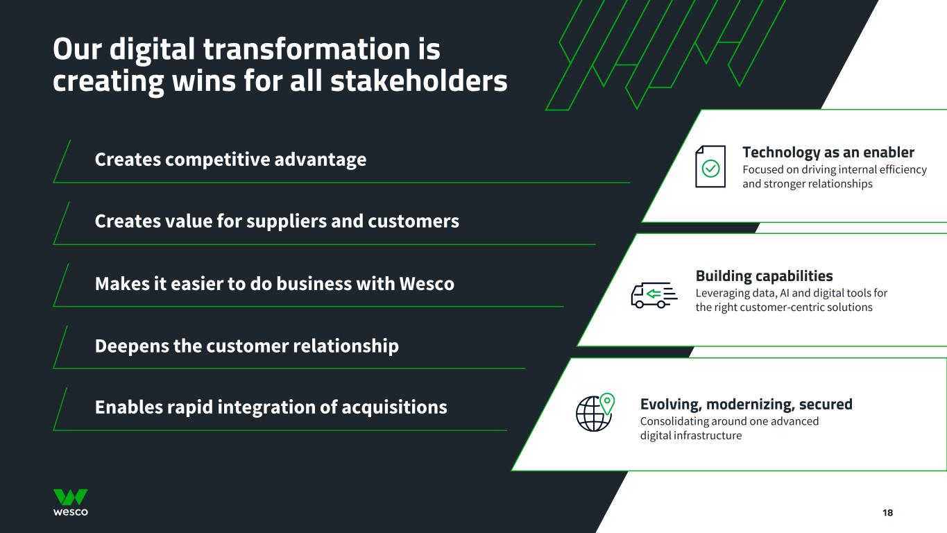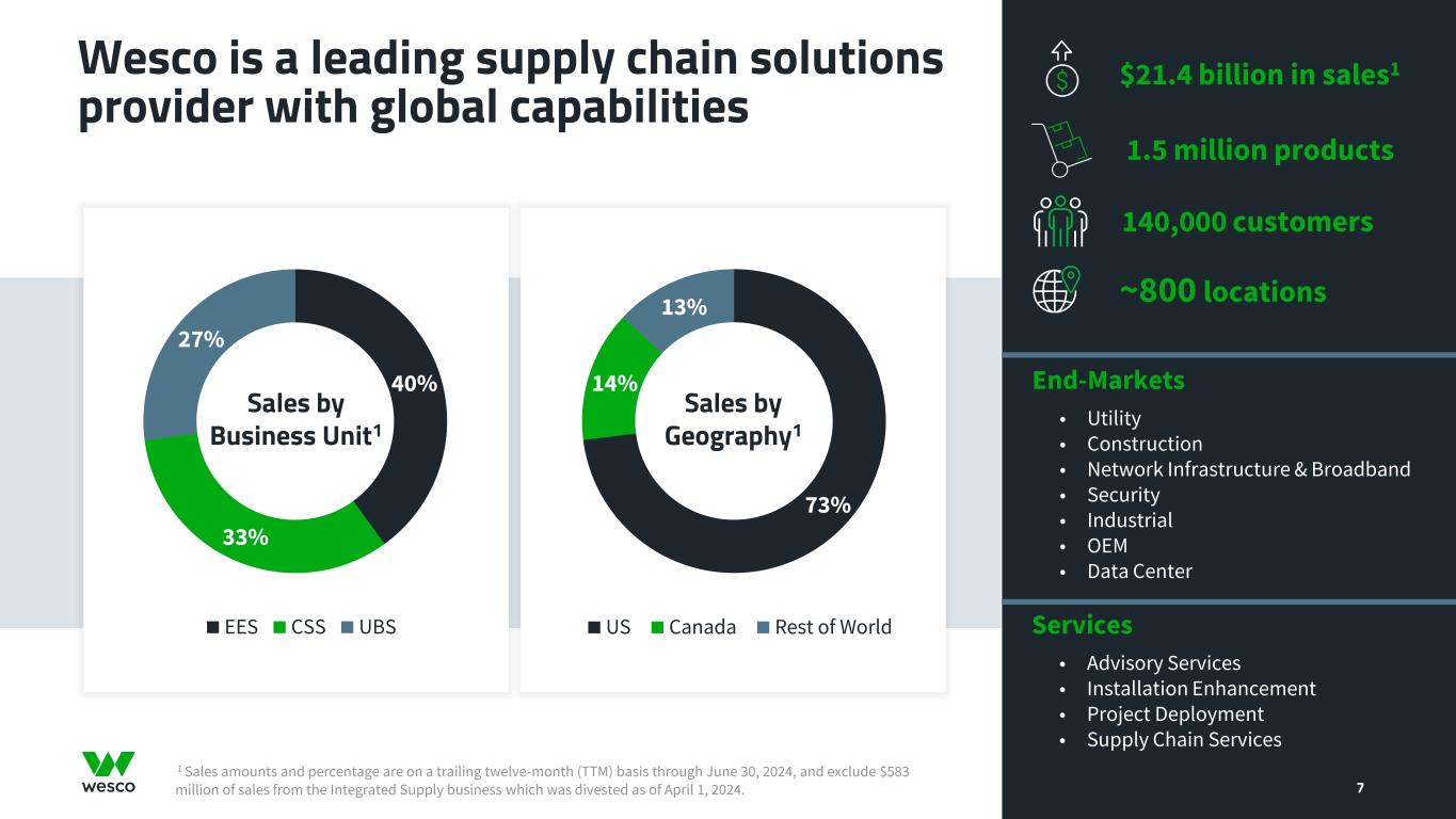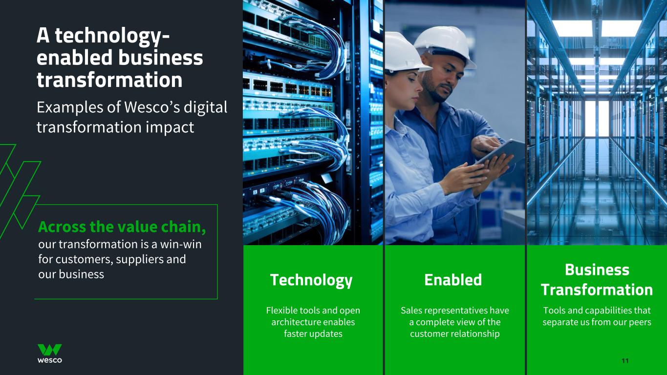 Forward-looking statements 2 All statements made herein that are not historical facts should be considered as "forward-looking statements" within the meaning of the Private Securities Litigation Reform Act of 1995. Such statements involve known and unknown risks, uncertainties and other factors that may cause actual results to differ materially. These statements include, but are not limited to, statements regarding business strategy, growth strategy, competitive strengths, productivity and profitability enhancement, competition, new product and service introductions, and liquidity and capital resources. Such statements can generally be identified by the use of words such as "anticipate," "plan," "believe," "estimate," "intend," "expect," "project," and similar words, phrases or expressions or future or conditional verbs such as "could," "may," "should," "will," and "would," although not all forward-looking statements contain such words. These forward-looking statements are based on current expectations and beliefs of Wesco's management, as well as assumptions made by, and information currently available to, Wesco's management, current market trends and market conditions and involve risks and uncertainties, many of which are outside of Wesco's and Wesco's management's control, and which may cause actual results to differ materially from those contained in forward-looking statements. Accordingly, you should not place undue reliance on such statements. Important factors that could cause actual results or events to differ materially from those presented or implied in the forward-looking statements include, among others, the failure to achieve the anticipated benefits of, and other risks associated with, acquisitions, joint ventures, divestitures and other corporate transactions; the inability to successfully integrate acquired businesses; the impact of increased interest rates or borrowing costs; fluctuations in currency exchange rates; failure to adequately protect Wesco's intellectual property or successfully defend against infringement claims; the inability to successfully deploy new technologies, digital products and information systems or to otherwise adapt to emerging technologies in the marketplace, such as those incorporating artificial intelligence; failure to execute on our efforts and programs related to environmental, social and governance (ESG) matters; unanticipated expenditures or other adverse developments related to compliance with new or stricter government policies, laws or regulations, including those relating to data privacy, sustainability and environmental protection; the inability to successfully develop, manage or implement new technology initiatives or business strategies, including with respect to the expansion of e-commerce capabilities and other digital solutions and digitalization initiatives; disruption of information technology systems or operations; natural disasters (including as a result of climate change), health epidemics, pandemics and other outbreaks; supply chain disruptions; geopolitical issues, including the impact of the evolving conflicts in the Middle East and Russia/Ukraine; the impact of sanctions imposed on, or other actions taken by the U.S. or other countries against, Russia or China; the failure to manage the increased risks and impacts of cyber incidents or data breaches; and exacerbation of key materials shortages, inflationary cost pressures, material cost increases, demand volatility, and logistics and capacity constraints, any of which may have a material adverse effect on the Company's business, results of operations and financial condition. All such factors are difficult to predict and are beyond the Company's control. Additional factors that could cause results to differ materially from those described above can be found in Wesco's most recent Annual Report on Form 10-K and other periodic reports filed with the U.S. Securities and Exchange Commission.