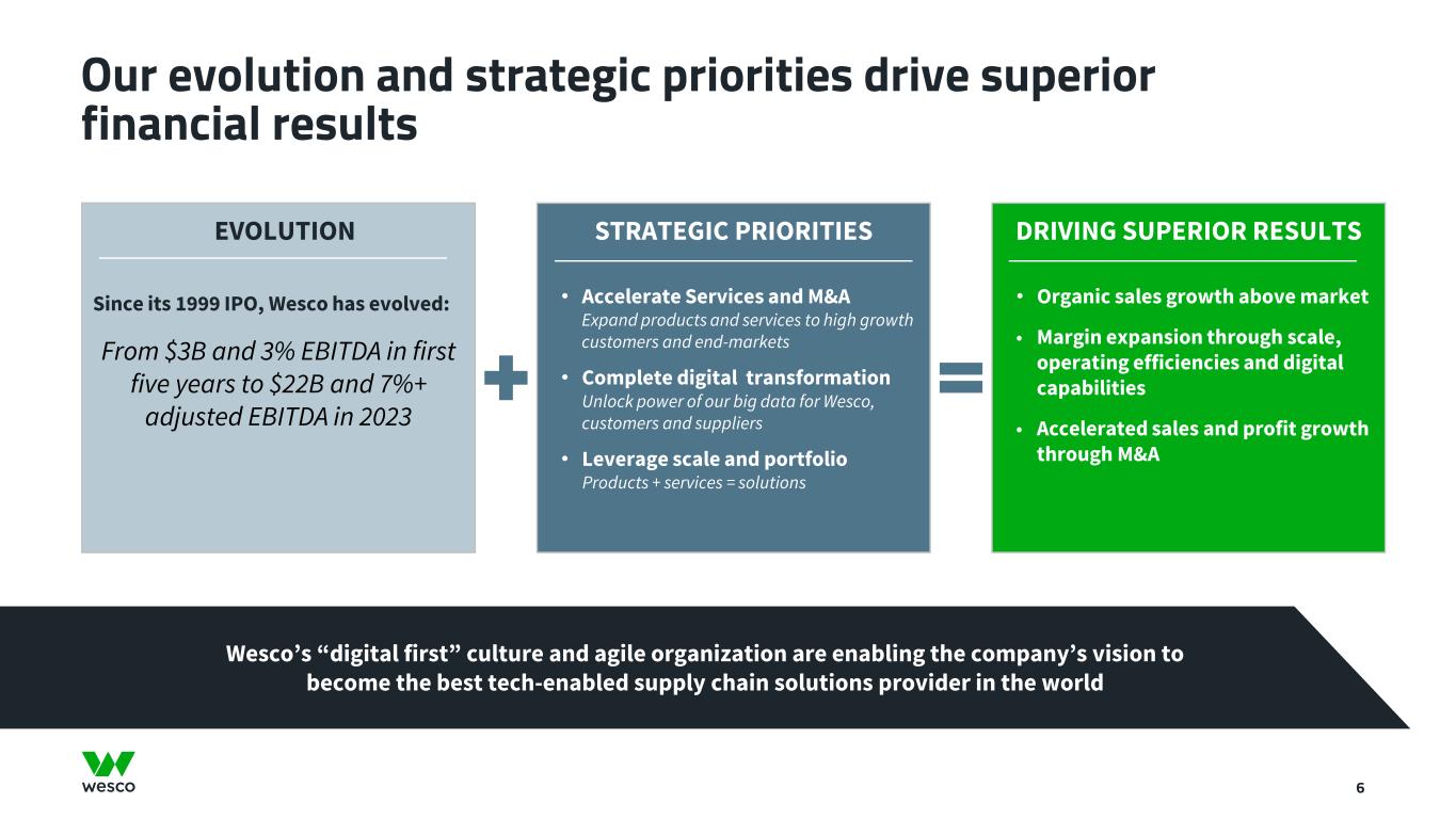 Why invest in Wesco Key elements of our investment thesis Wesco is leveraging its sustainable value creation generating attractive returns with significant multiple expansion opportunity Market leader serving attractive end-markets Best positioned to deliver outsized growth due to the secular trends of AI-driven data centers, increased power generation and demand, electrification, IoT/automation and reshoring 01 Significant cash generation to invest in additional services and acquisitions Capital prioritized to invest in M&A, while supporting a consistent stock buyback program and increasing dividends 02 Business transformation to drive efficiencies and expand margins; enabled by digital ecosystem Will enable Wesco to accelerate our growth through greater cross-sell, expand our margins through pricing and operating leverage, and increase our speed to value for future acquisitions 03 5