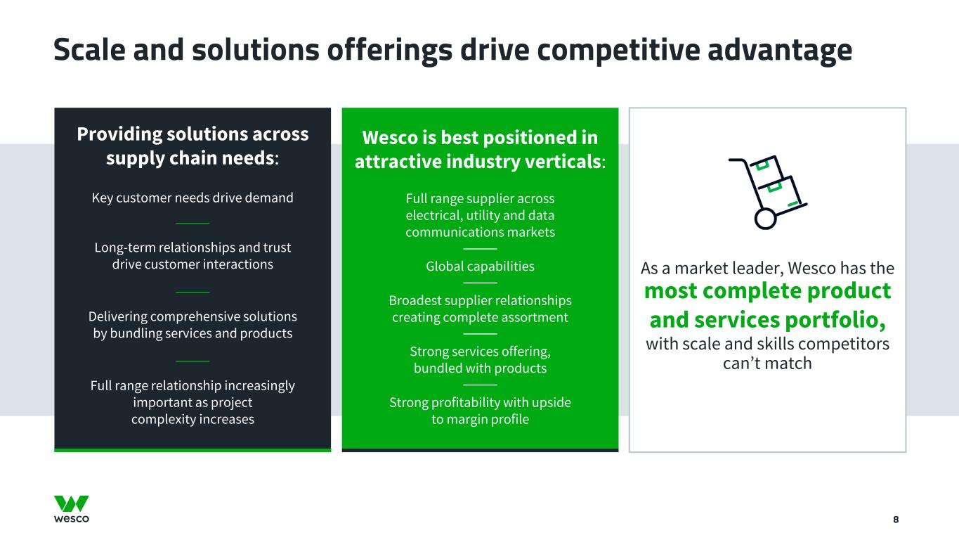 73% 14% 13% US Canada Rest of World Sales by Geography1 Wesco is a leading supply chain solutions provider with global capabilities 7 40% 33% 27% EES CSS UBS Sales by Business Unit1 140,000 customers 1.5 million products ~800 locations End-Markets • Utility • Construction • Network Infrastructure & Broadband • Security • Industrial • OEM • Data Center Services • Advisory Services • Installation Enhancement • Project Deployment • Supply Chain Services 1 Sales amounts and percentage are on a trailing twelve-month (TTM) basis through June 30, 2024, and exclude $583 million of sales from the Integrated Supply business which was divested as of April 1, 2024. $21.4 billion in sales1