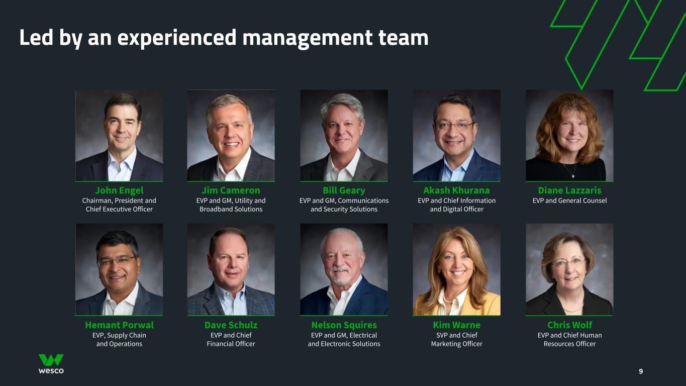Scale and solutions offerings drive competitive advantage 8 As a market leader, Wesco has the most complete product and services portfolio, with scale and skills competitors can’t match Providing solutions across supply chain needs: Key customer needs drive demand Long-term relationships and trust drive customer interactions Delivering comprehensive solutions by bundling services and products Full range relationship increasingly important as project complexity increases Wesco is best positioned in attractive industry verticals: Full range supplier across electrical, utility and data communications markets Global capabilities Broadest supplier relationships creating complete assortment Strong services offering, bundled with products Strong profitability with upside to margin profile