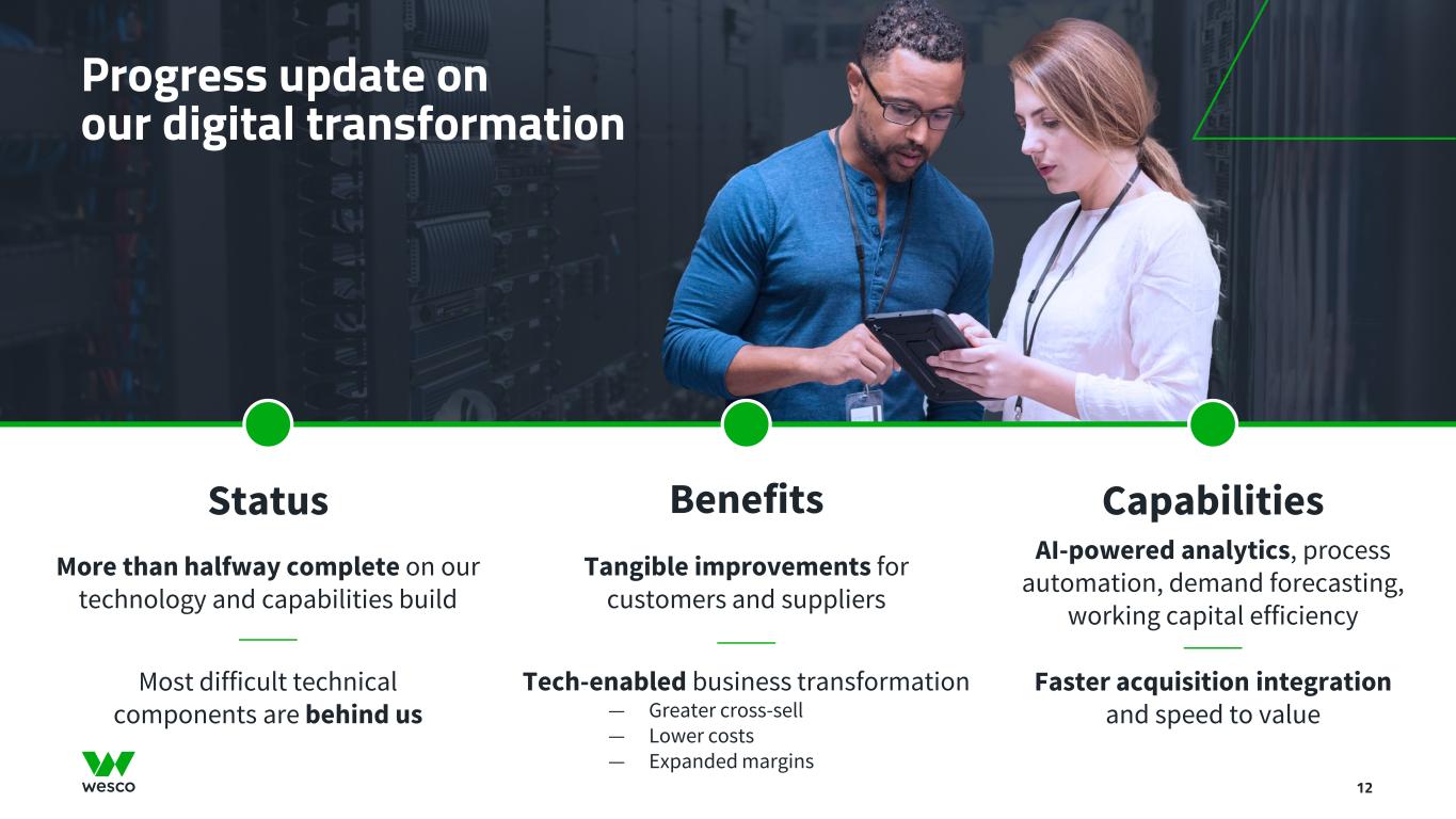 A technology- enabled business transformation Examples of Wesco’s digital transformation impact Technology Enabled Business Transformation 11 Flexible tools and open architecture enables faster updates Sales representatives have a complete view of the customer relationship Tools and capabilities that separate us from our peers Across the value chain, our transformation is a win-win for customers, suppliers and our business
