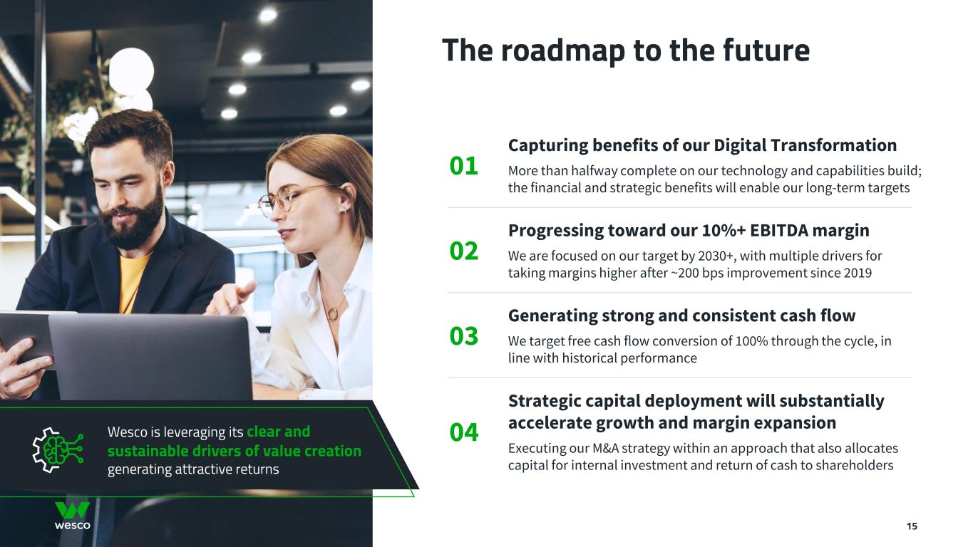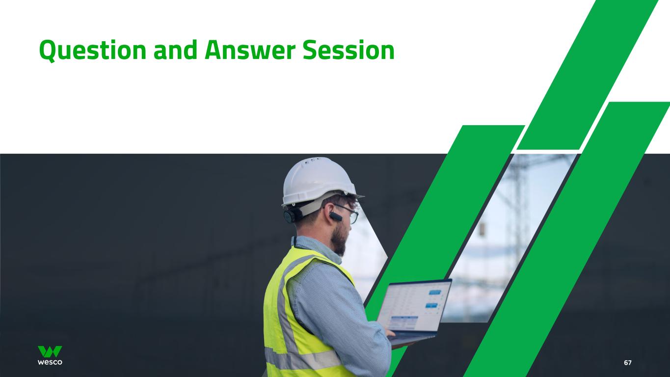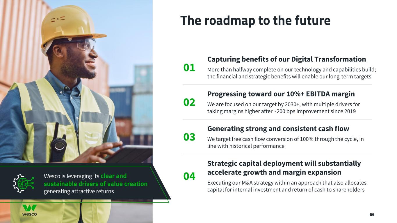 The roadmap to the future Capturing benefits of our Digital Transformation More than halfway complete on our technology and capabilities build; the financial and strategic benefits will enable our long-term targets 01 Progressing toward our 10%+ EBITDA margin We are focused on our target by 2030+, with multiple drivers for taking margins higher after ~200 bps improvement since 2019 02 04 Strategic capital deployment will substantially accelerate growth and margin expansion Executing our M&A strategy within an approach that also allocates capital for internal investment and return of cash to shareholders Generating strong and consistent cash flow We target free cash flow conversion of 100% through the cycle, in line with historical performance 03 Wesco is leveraging its clear and sustainable drivers of value creation generating attractive returns 66