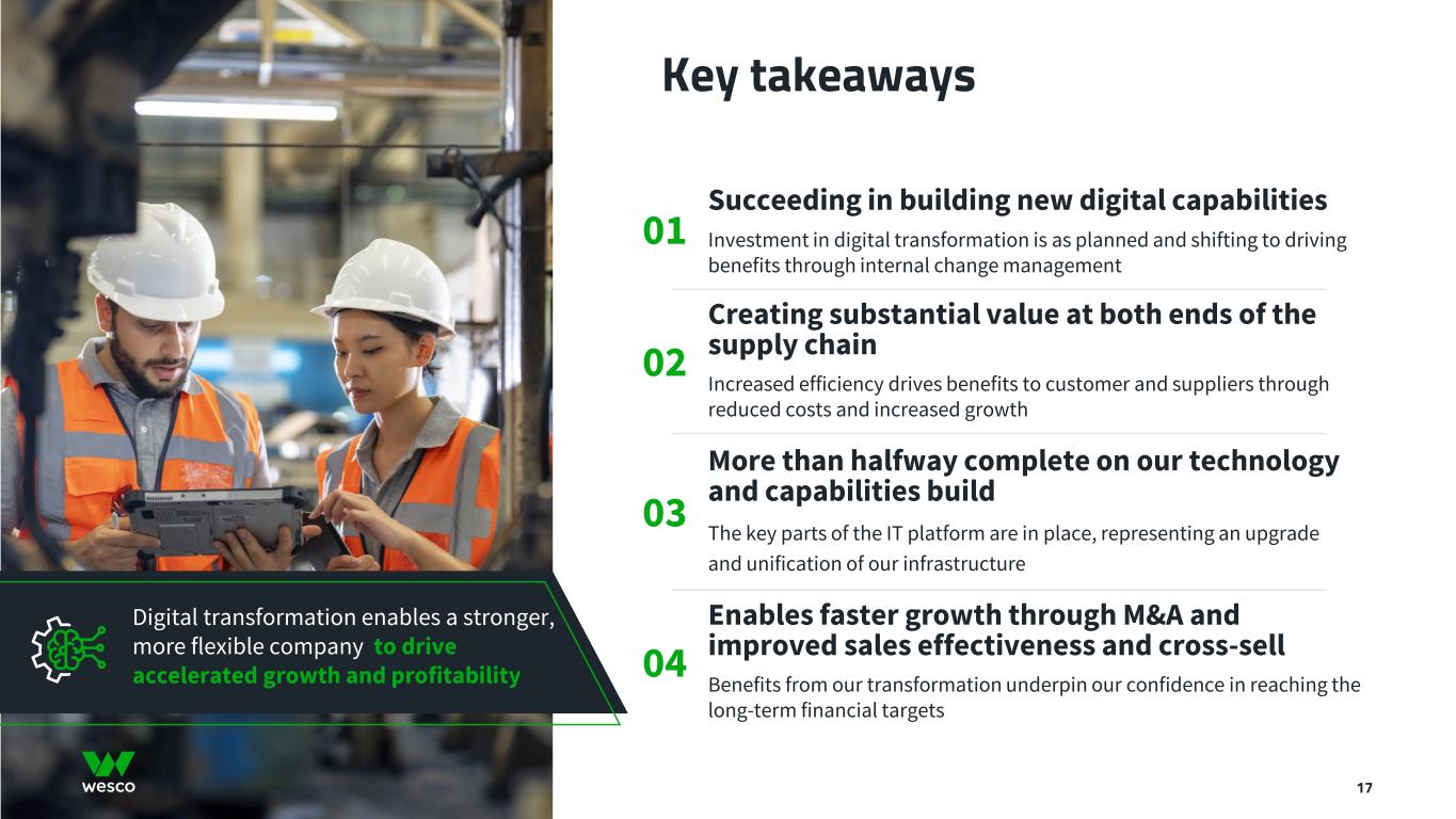 Wesco is leveraging its clear and sustainable drivers of value creation generating attractive returns 15 The roadmap to the future Capturing benefits of our Digital Transformation More than halfway complete on our technology and capabilities build; the financial and strategic benefits will enable our long-term targets 01 Progressing toward our 10%+ EBITDA margin We are focused on our target by 2030+, with multiple drivers for taking margins higher after ~200 bps improvement since 2019 02 04 Strategic capital deployment will substantially accelerate growth and margin expansion Executing our M&A strategy within an approach that also allocates capital for internal investment and return of cash to shareholders Generating strong and consistent cash flow We target free cash flow conversion of 100% through the cycle, in line with historical performance 03