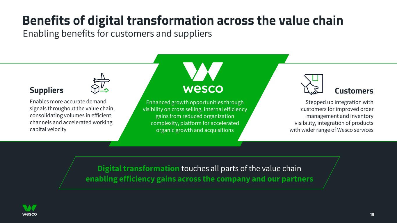 Evolving, modernizing, secured Consolidating around one advanced digital infrastructure Technology as an enabler Focused on driving internal efficiency and stronger relationships Building capabilities Leveraging data, AI and digital tools for the right customer-centric solutions Creates competitive advantage Creates value for suppliers and customers Makes it easier to do business with Wesco Deepens the customer relationship Enables rapid integration of acquisitions Our digital transformation is creating wins for all stakeholders 18