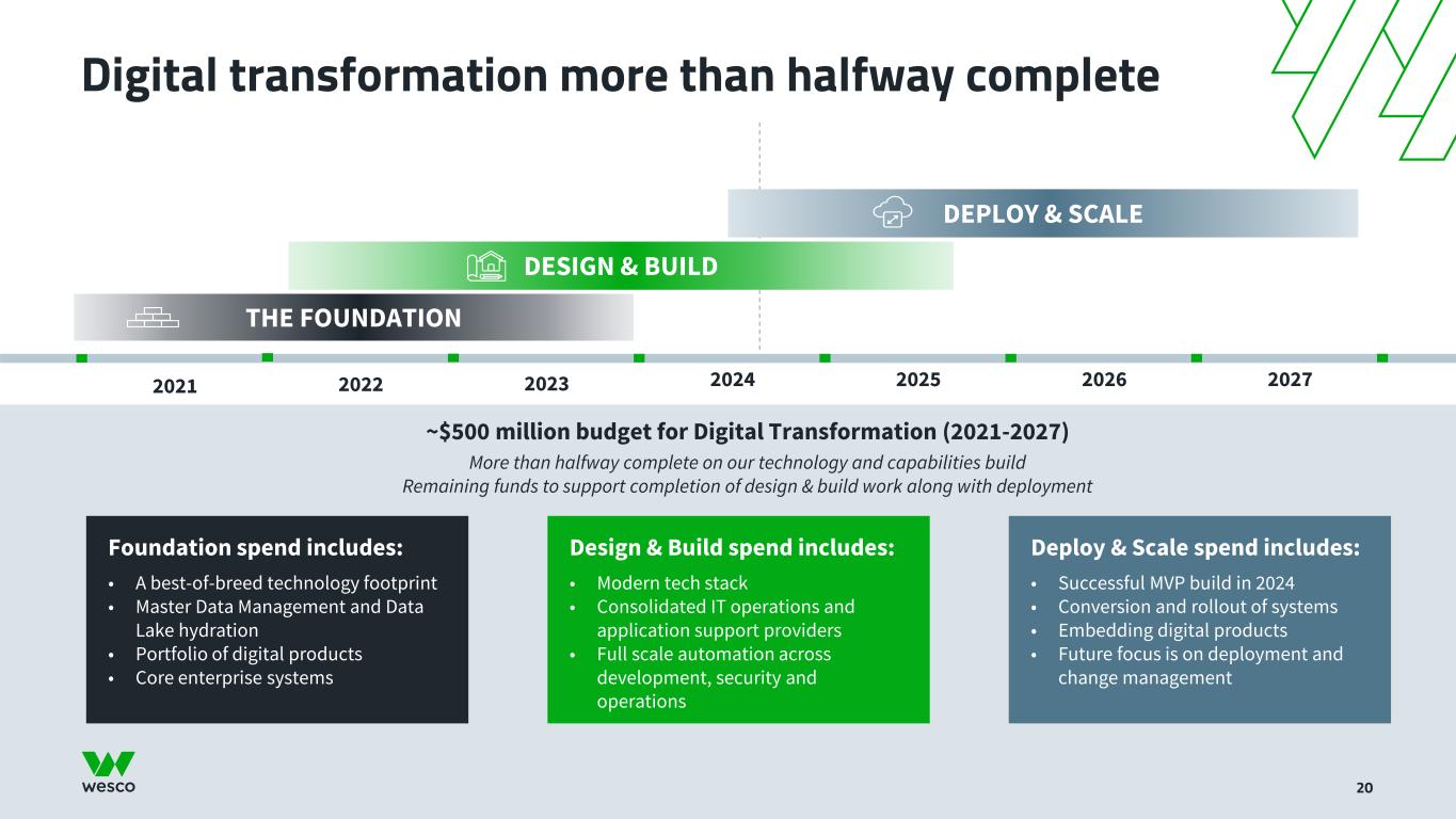 19 Benefits of digital transformation across the value chain Enabling benefits for customers and suppliers Digital transformation touches all parts of the value chain enabling efficiency gains across the company and our partners Enhanced growth opportunities through visibility on cross selling, internal efficiency gains from reduced organization complexity, platform for accelerated organic growth and acquisitions Suppliers Enables more accurate demand signals throughout the value chain, consolidating volumes in efficient channels and accelerated working capital velocity Customers Stepped up integration with customers for improved order management and inventory visibility, integration of products with wider range of Wesco services