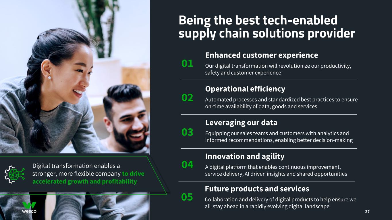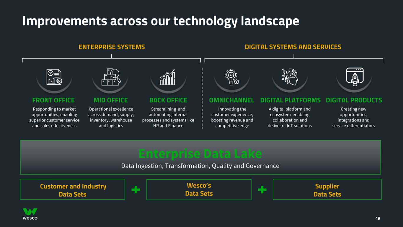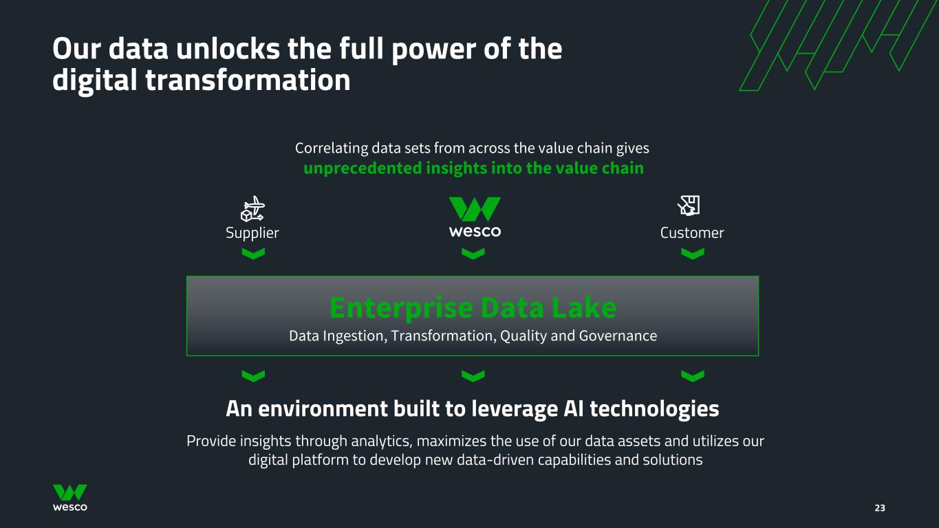 22 Improvements across our technology landscape BACK OFFICE Streamlining and automating internal processes and systems like HR and Finance MID OFFICE Operational excellence across demand, supply, inventory, warehouse and logistics FRONT OFFICE Responding to market opportunities, enabling superior customer service and sales effectiveness Innovating the customer experience, boosting revenue and competitive edge OMNICHANNEL DIGITAL PLATFORMS A digital platform and ecosystem enabling collaboration and deliver of IoT solutions DIGITAL PRODUCTS Creating new opportunities, integrations and service differentiators ENTERPRISE SYSTEMS DIGITAL SYSTEMS AND SERVICES Supplier Data Sets Wesco’s Data Sets Customer and Industry Data Sets Enterprise Data Lake Data Ingestion, Transformation, Quality and Governance