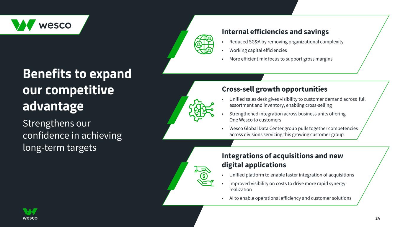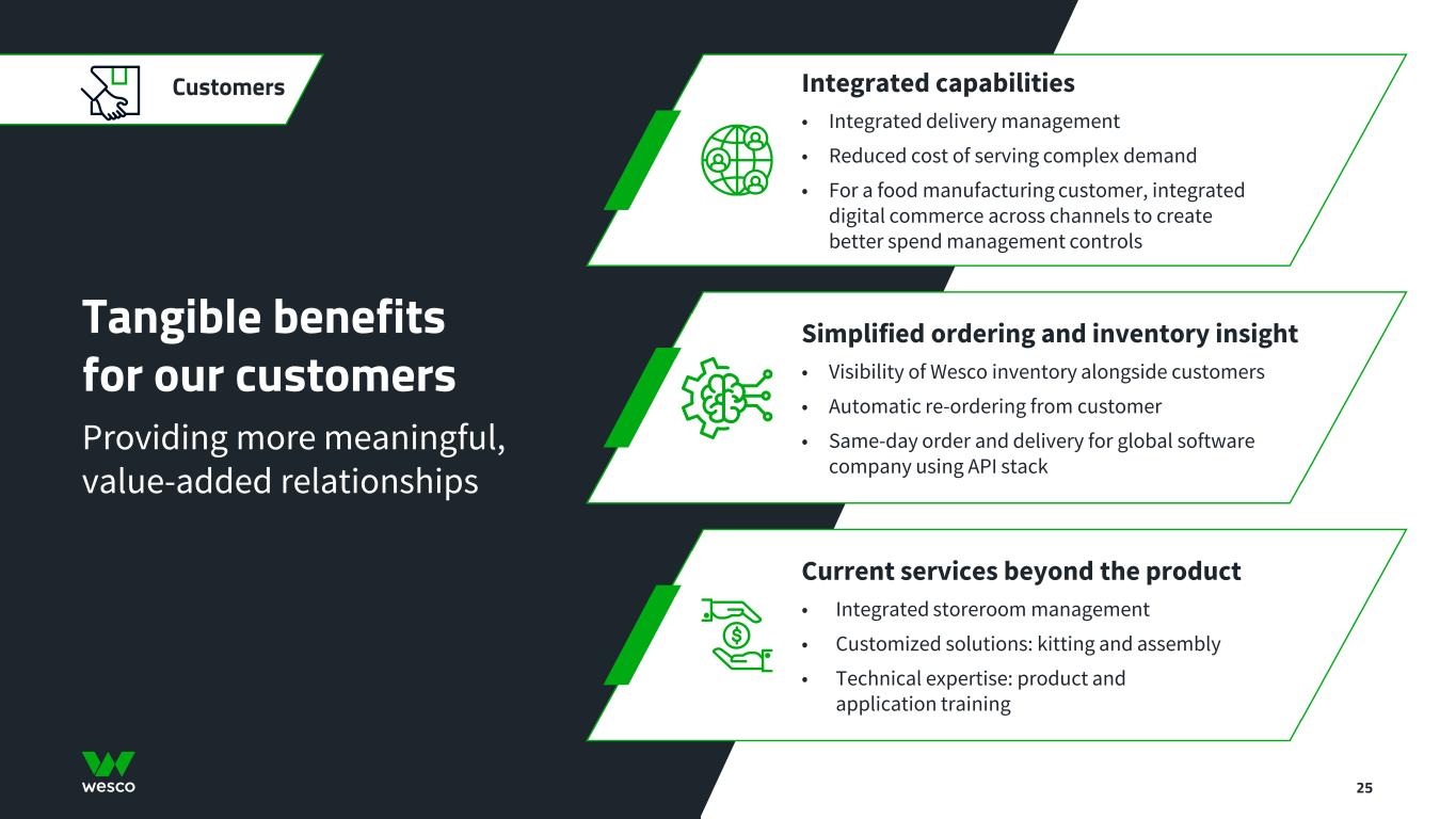 24 Benefits to expand our competitive advantage Strengthens our confidence in achieving long-term targets Internal efficiencies and savings • Reduced SG&A by removing organizational complexity • Working capital efficiencies • More efficient mix focus to support gross margins Cross-sell growth opportunities • Unified sales desk gives visibility to customer demand across full assortment and inventory, enabling cross-selling • Strengthened integration across business units offering One Wesco to customers • Wesco Global Data Center group pulls together competencies across divisions servicing this growing customer group Integrations of acquisitions and new digital applications • Unified platform to enable faster integration of acquisitions • Improved visibility on costs to drive more rapid synergy realization • AI to enable operational efficiency and customer solutions