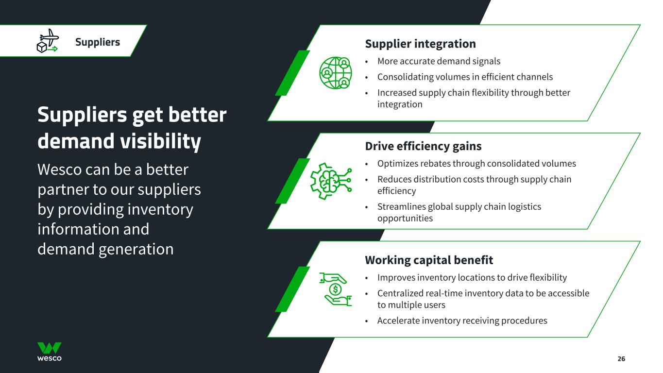 25 Tangible benefits for our customers Providing more meaningful, value-added relationships Integrated capabilities • Integrated delivery management • Reduced cost of serving complex demand • For a food manufacturing customer, integrated digital commerce across channels to create better spend management controls Simplified ordering and inventory insight • Visibility of Wesco inventory alongside customers • Automatic re-ordering from customer • Same-day order and delivery for global software company using API stack Current services beyond the product • Integrated storeroom management • Customized solutions: kitting and assembly • Technical expertise: product and application training Customers