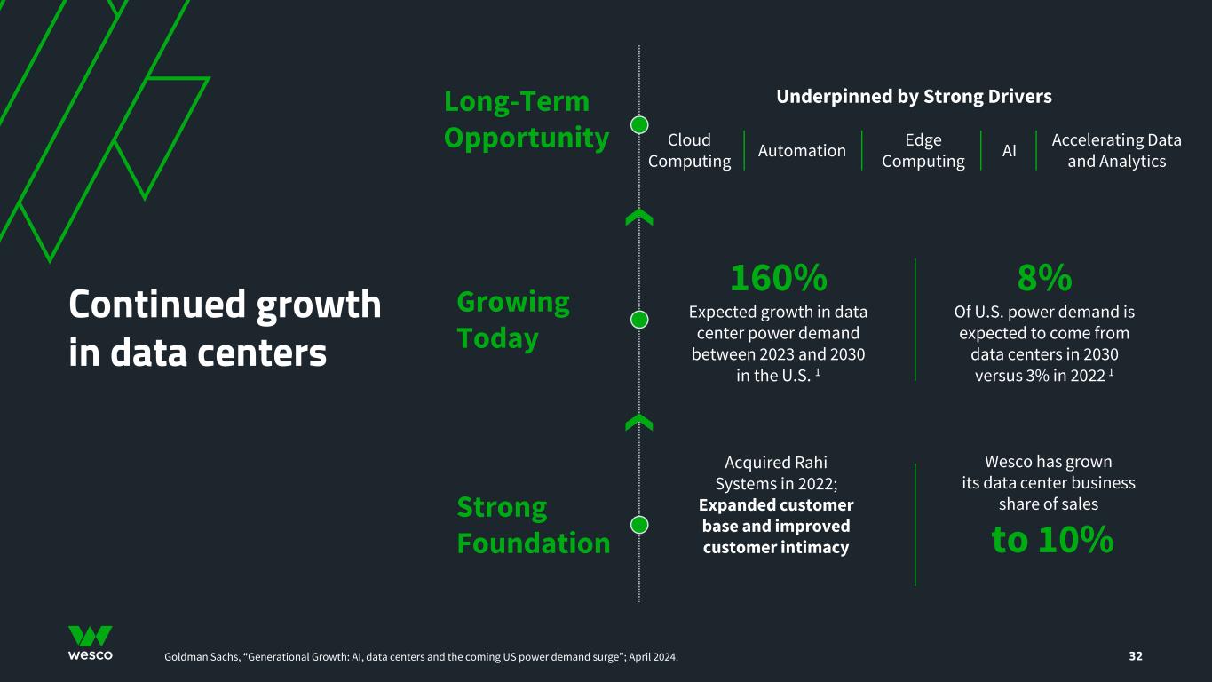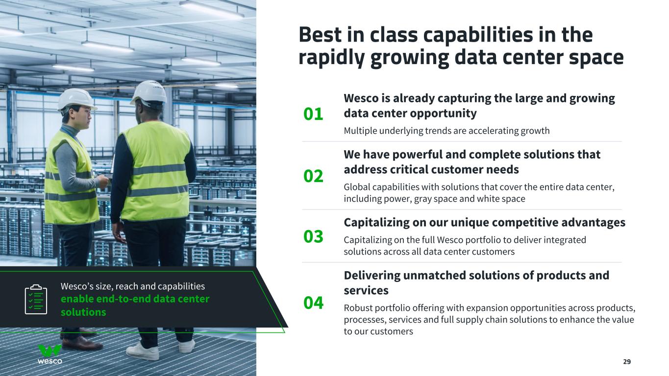 Best in class capabilities in the rapidly growing data center space Wesco’s size, reach and capabilities enable end-to-end data center solutions Wesco is already capturing the large and growing data center opportunity Multiple underlying trends are accelerating growth 01 We have powerful and complete solutions that address critical customer needs Global capabilities with solutions that cover the entire data center, including power, gray space and white space 02 04 Delivering unmatched solutions of products and services Robust portfolio offering with expansion opportunities across products, processes, services and full supply chain solutions to enhance the value to our customers Capitalizing on our unique competitive advantages Capitalizing on the full Wesco portfolio to deliver integrated solutions across all data center customers 03 29