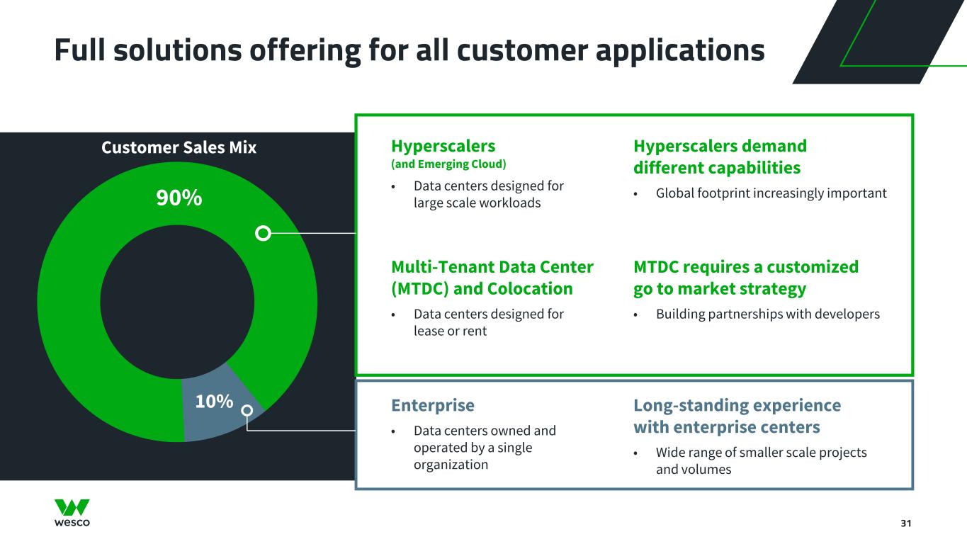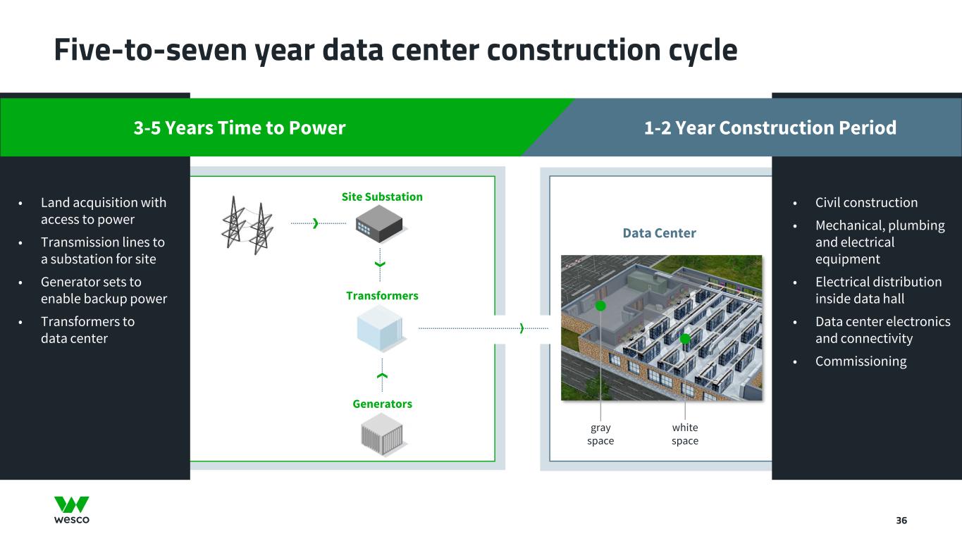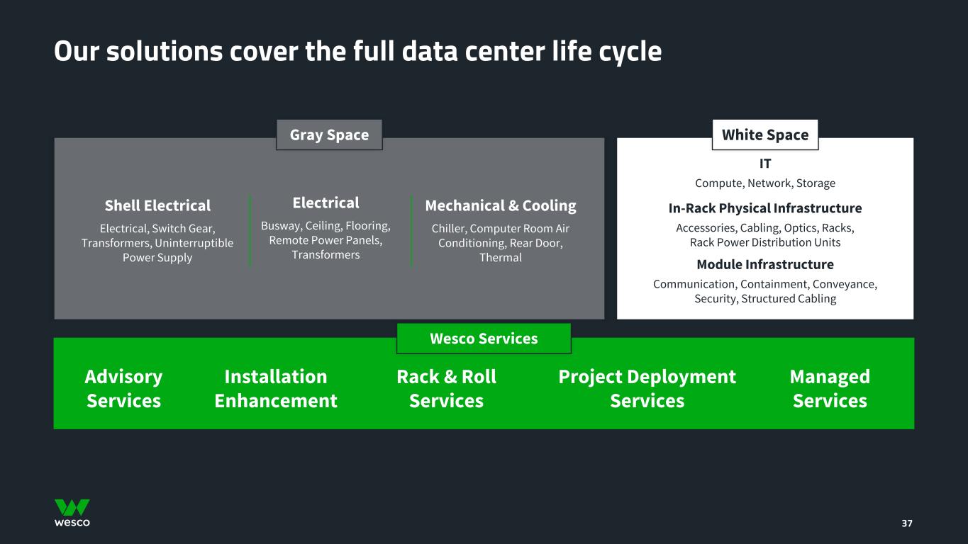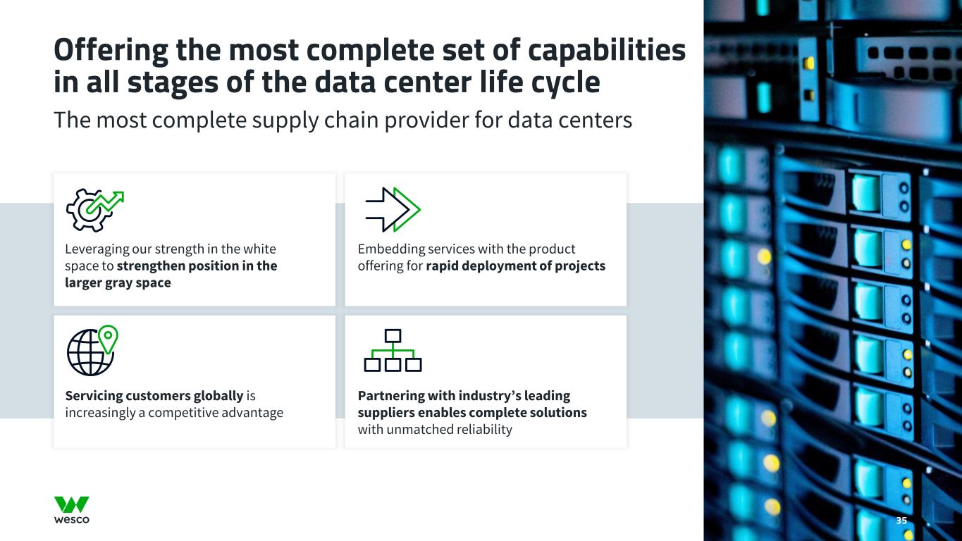 34 Unmatched depth and breadth of products and services Wesco has unique differentiators for data center customers 01 Expansive Product and Services Portfolio Technology, solutions, products and services 02 Comprehensive Expertise Crossing gray and white spaces, our scale and breadth of capabilities are key advantages for hyperscale customers 03 Global Ecosystem Leveraging best-in-class contractors, integrators, installers and suppliers across the entire Wesco ecosystem 04 Holistic Solutions End-to-end global services, solutions, capabilities and offerings, project and life cycle management 05 Trusted Partner Building customized solutions for all customer types (hyperscale, enterprise, MTDC, etc) to support their long-term operations and initiatives