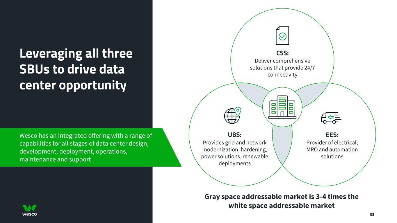 32 Continued growth in data centers Goldman Sachs, “Generational Growth: AI, data centers and the coming US power demand surge”; April 2024. Growing Today 160% Expected growth in data center power demand between 2023 and 2030 in the U.S. 1 8% Of U.S. power demand is expected to come from data centers in 2030 versus 3% in 2022 1 Long-Term Opportunity Underpinned by Strong Drivers Cloud Computing Automation Edge Computing AI Accelerating Data and Analytics Wesco has grown its data center business share of sales to 10% Acquired Rahi Systems in 2022; Expanded customer base and improved customer intimacy Strong Foundation