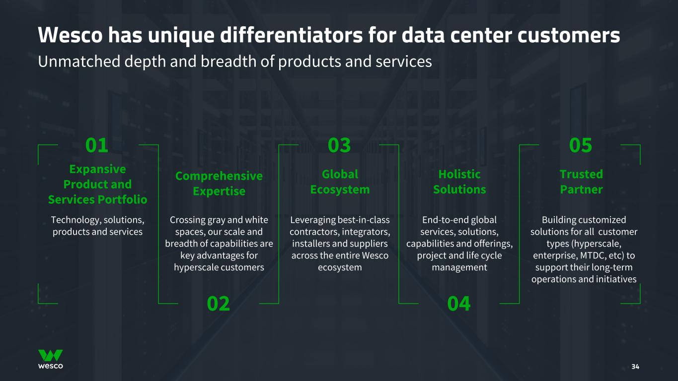 33 Leveraging all three SBUs to drive data center opportunity Wesco has an integrated offering with a range of capabilities for all stages of data center design, development, deployment, operations, maintenance and support Gray space addressable market is 3-4 times the white space addressable market CSS: Deliver comprehensive solutions that provide 24/7 connectivity EES: Provider of electrical, MRO and automation solutions UBS: Provides grid and network modernization, hardening, power solutions, renewable deployments