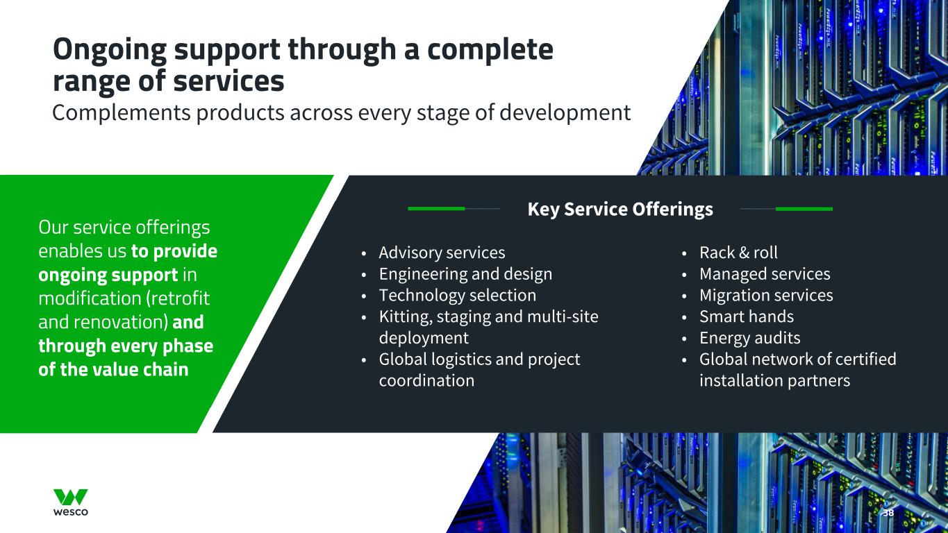 37 Our solutions cover the full data center life cycle IT Compute, Network, Storage In-Rack Physical Infrastructure Accessories, Cabling, Optics, Racks, Rack Power Distribution Units Module Infrastructure Communication, Containment, Conveyance, Security, Structured Cabling White SpaceGray Space Advisory Services Installation Enhancement Managed Services Project Deployment Services Rack & Roll Services Shell Electrical Electrical, Switch Gear, Transformers, Uninterruptible Power Supply Electrical Busway, Ceiling, Flooring, Remote Power Panels, Transformers Mechanical & Cooling Chiller, Computer Room Air Conditioning, Rear Door, Thermal Wesco Services
