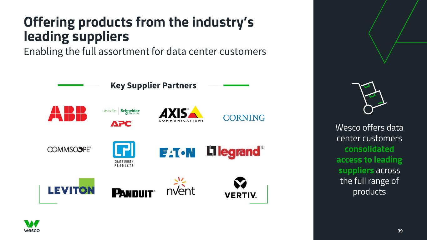 Wesco offers data center customers consolidated access to leading suppliers across the full range of products Offering products from the industry’s leading suppliers 39 Key Supplier Partners Enabling the full assortment for data center customers