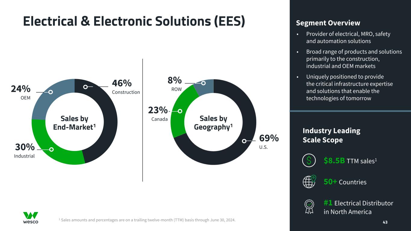 Electrical & Electronic Solutions (EES) 43 Industry Leading Scale Scope • Provider of electrical, MRO, safety and automation solutions • Broad range of products and solutions primarily to the construction, industrial and OEM markets • Uniquely positioned to provide the critical infrastructure expertise and solutions that enable the technologies of tomorrow 69% U.S. 8% ROW 23% Canada 30% Industrial 24% OEM 46% Construction 50+ Countries #1 Electrical Distributor in North America $8.5B TTM sales1 Sales by End-Market1 Sales by Geography1 Segment Overview 1 Sales amounts and percentages are on a trailing twelve-month (TTM) basis through June 30, 2024.