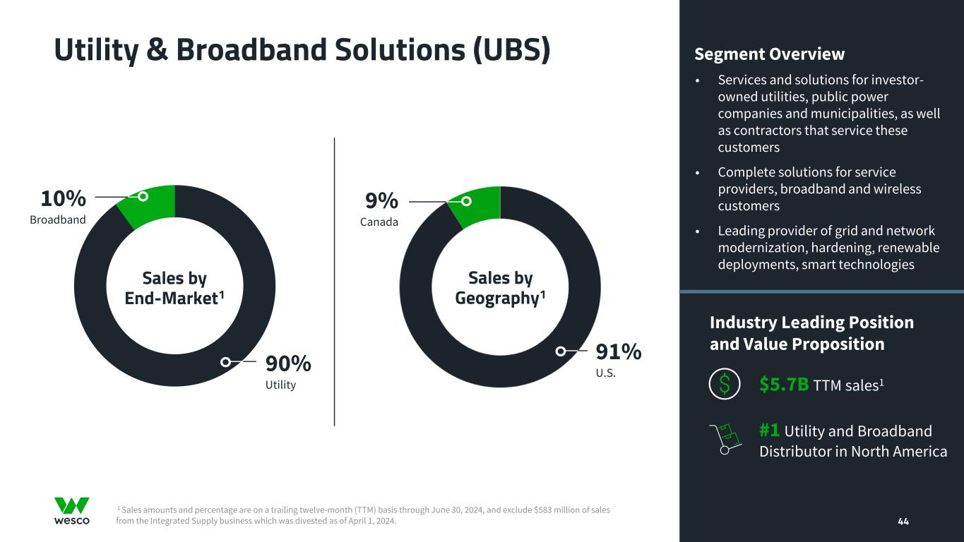 Utility & Broadband Solutions (UBS) 44 • Services and solutions for investor- owned utilities, public power companies and municipalities, as well as contractors that service these customers • Complete solutions for service providers, broadband and wireless customers • Leading provider of grid and network modernization, hardening, renewable deployments, smart technologies Industry Leading Position and Value Proposition Sales by End-Market1 Sales by Geography1 91% U.S. 9% Canada 10% Broadband 90% Utility #1 Utility and Broadband Distributor in North America $5.7B TTM sales1 Segment Overview 1 Sales amounts and percentage are on a trailing twelve-month (TTM) basis through June 30, 2024, and exclude $583 million of sales from the Integrated Supply business which was divested as of April 1, 2024.