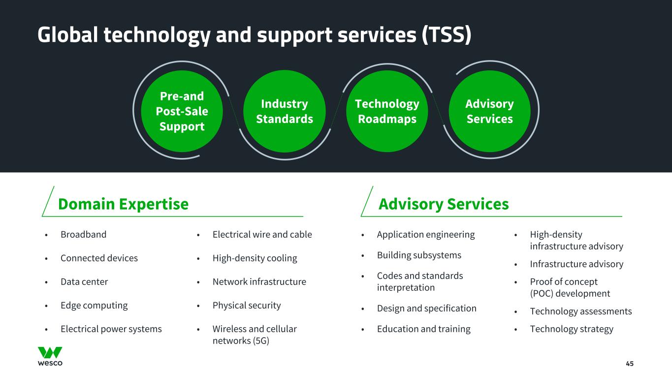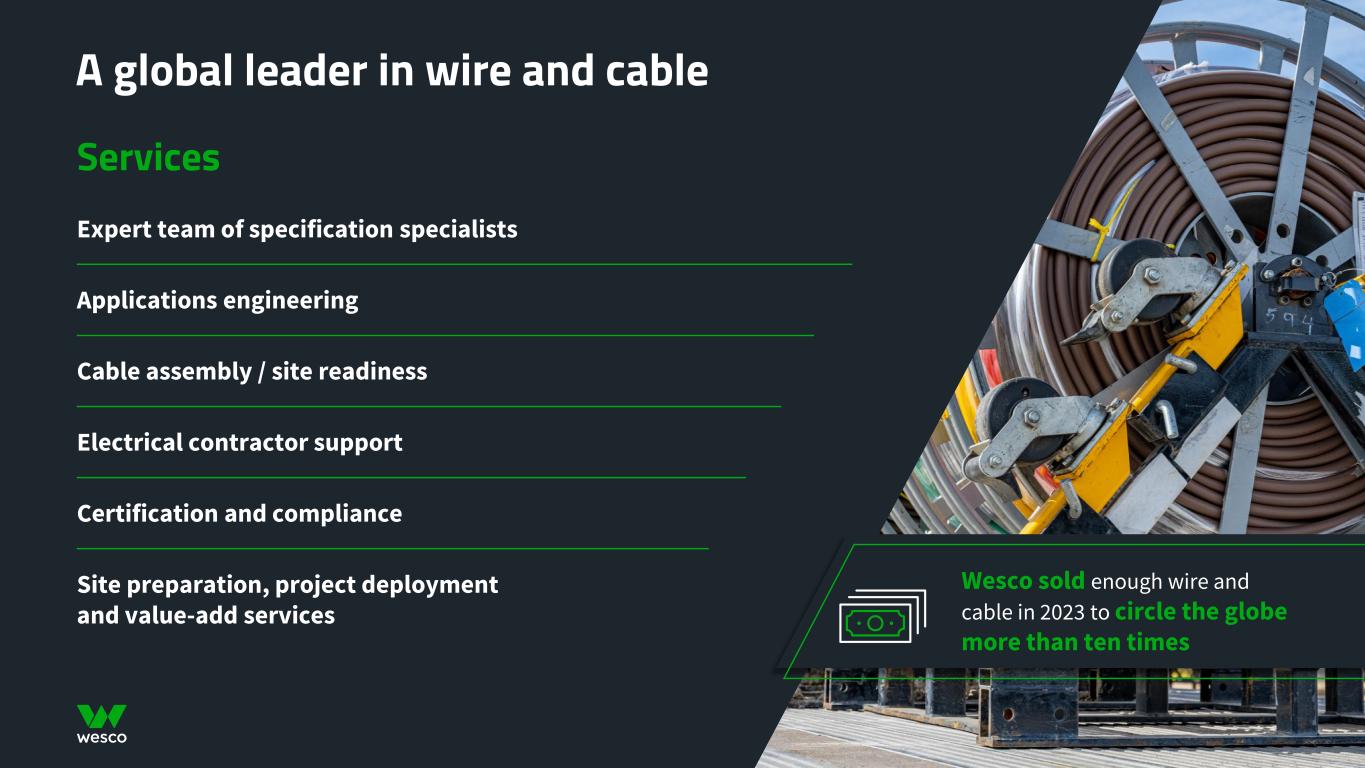 A global leader in wire and cable 47 Services Wesco sold enough wire and cable in 2023 to circle the globe more than ten times. Expert team of specification specialists Cable assembly / site readiness Applications engineering Electrical contractor support Certification and compliance Site preparation, project deployment and value-add services