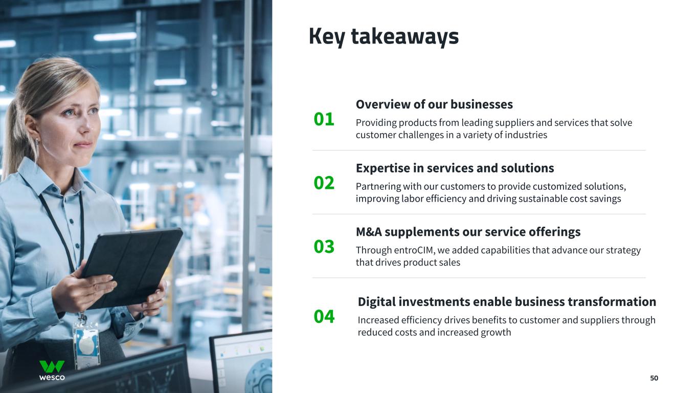49 Improvements across our technology landscape BACK OFFICE Streamlining and automating internal processes and systems like HR and Finance MID OFFICE Operational excellence across demand, supply, inventory, warehouse and logistics FRONT OFFICE Responding to market opportunities, enabling superior customer service and sales effectiveness Innovating the customer experience, boosting revenue and competitive edge OMNICHANNEL DIGITAL PLATFORMS A digital platform and ecosystem enabling collaboration and deliver of IoT solutions DIGITAL PRODUCTS Creating new opportunities, integrations and service differentiators ENTERPRISE SYSTEMS DIGITAL SYSTEMS AND SERVICES Supplier Data Sets Wesco’s Data Sets Customer and Industry Data Sets Enterprise Data Lake Data Ingestion, Transformation, Quality and Governance