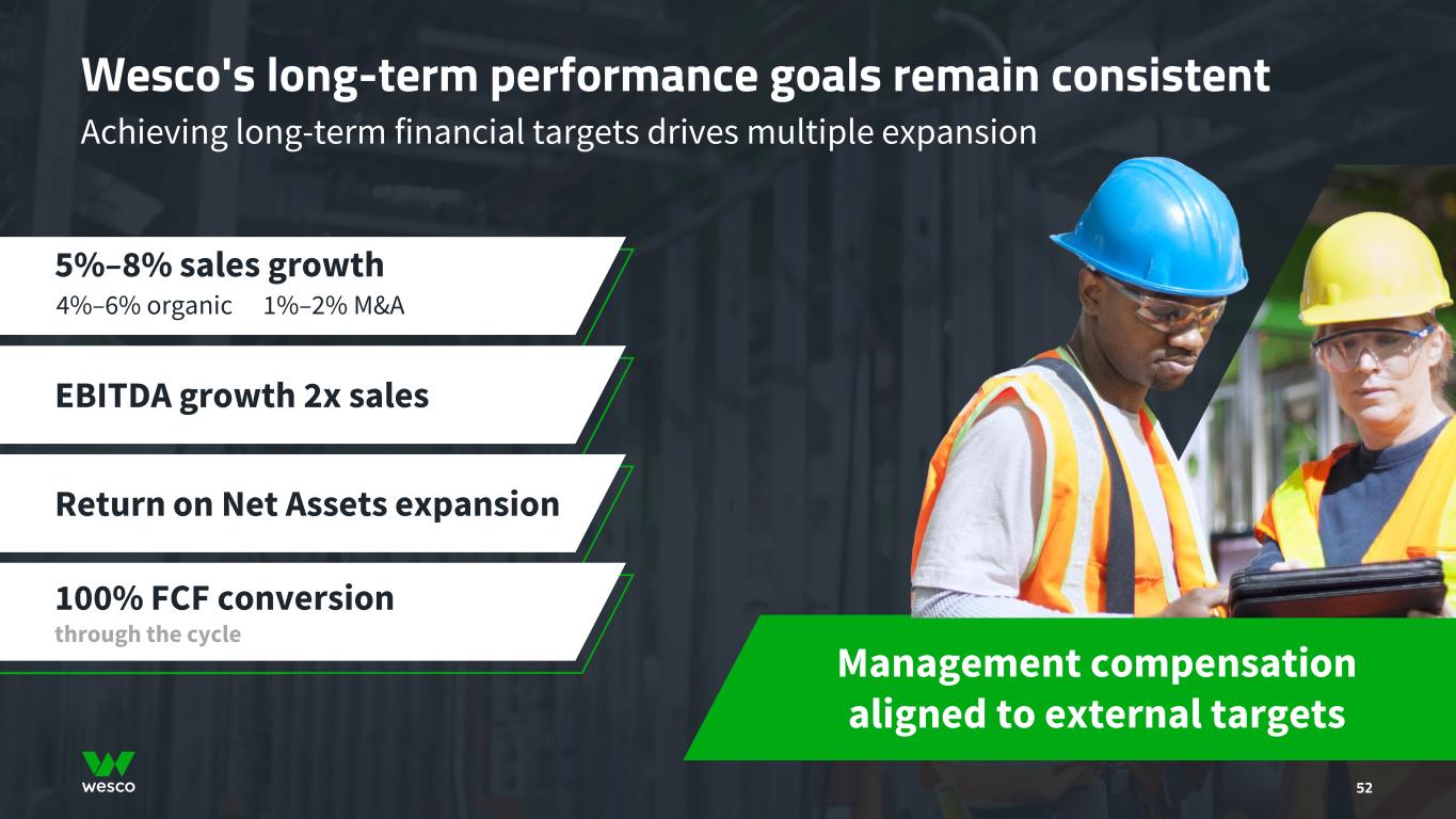 5%–8% sales growth EBITDA growth 2x sales Return on Net Assets expansion 100% FCF conversion through the cycle Wesco's long-term performance goals remain consistent Achieving long-term financial targets drives multiple expansion 52 Management compensation aligned to external targets 4%–6% organic 1%–2% M&A