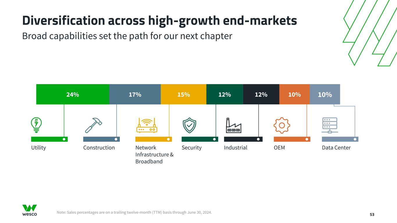 Broad capabilities set the path for our next chapter Diversification across high-growth end-markets 53 24% 17% 15% 12% 12% 10% 10% Industrial OEM Data CenterUtility Construction Network Infrastructure & Broadband Security Note: Sales percentages are on a trailing twelve-month (TTM) basis through June 30, 2024.