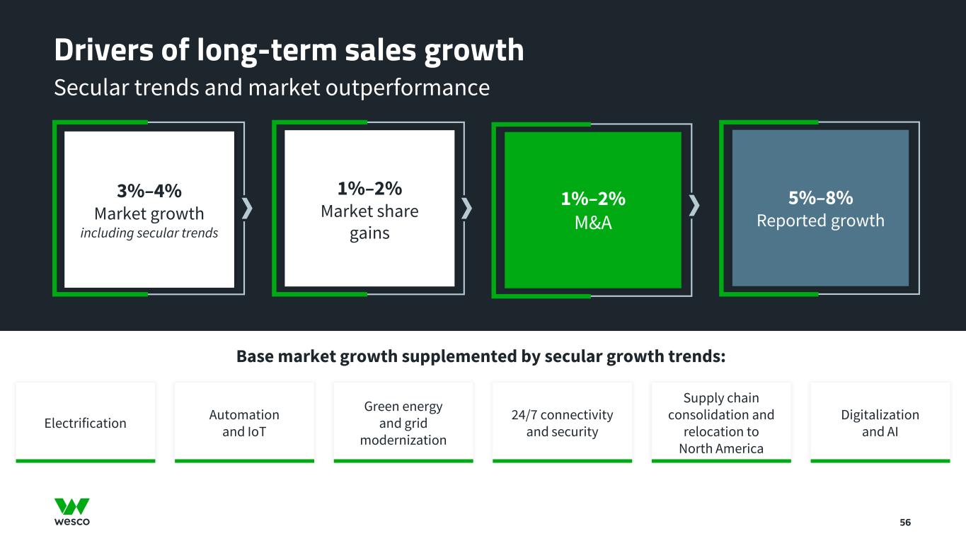 Electrification Automation and IoT Green energy and grid modernization 24/7 connectivity and security Supply chain consolidation and relocation to North America Digitalization and AI Secular trends and market outperformance Drivers of long-term sales growth Base market growth supplemented by secular growth trends: 5%–8% Reported growth 56 3%–4% Market growth including secular trends 1%–2% Market share gains 1%–2% M&A