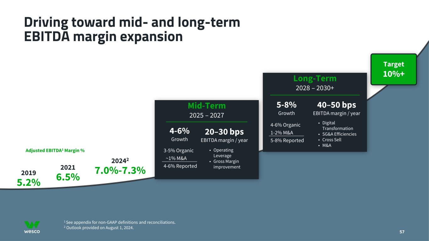 Driving toward mid- and long-term EBITDA margin expansion 1 See appendix for non-GAAP definitions and reconciliations. 2 Outlook provided on August 1, 2024. 57 2021 6.5%2019 5.2% 20242 7.0%-7.3% Adjusted EBITDA1 Margin % Mid-Term 2025 – 2027 4-6% Growth 20–30 bps EBITDA margin / year 3-5% Organic ~1% M&A 4-6% Reported • Operating Leverage • Gross Margin improvement Long-Term 2028 – 2030+ 4-6% Organic 1-2% M&A 5-8% Reported • Digital Transformation • SG&A Efficiencies • Cross Sell • M&A 5-8% Growth 40–50 bps EBITDA margin / year Target 10%+