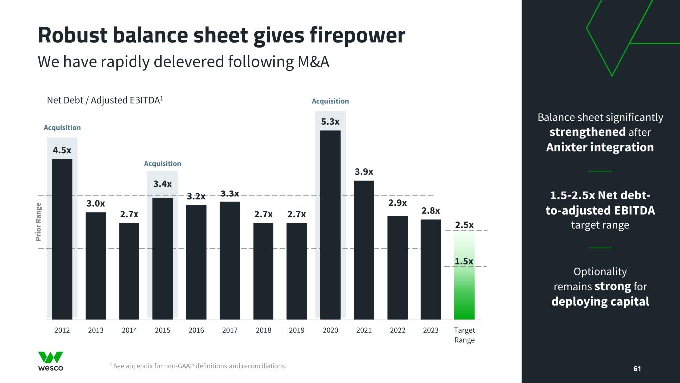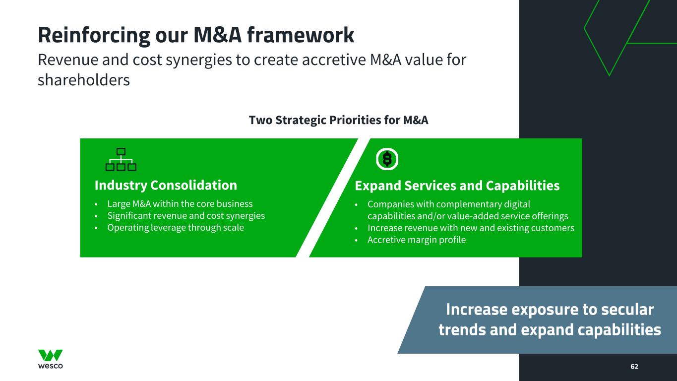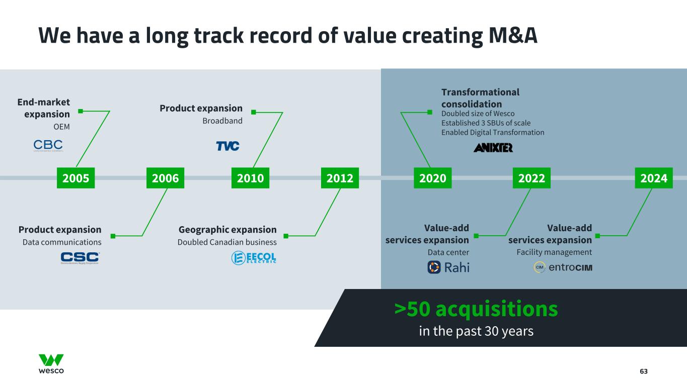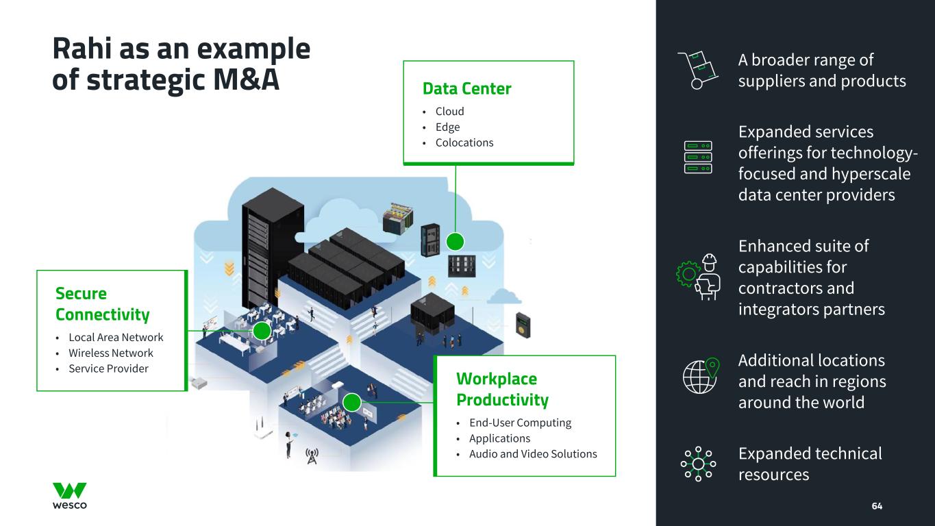We have a long track record of value creating M&A 63 >50 acquisitions in the past 30 years Geographic expansion Doubled Canadian business Product expansion Data communications End-market expansion OEM Product expansion Broadband Transformational consolidation 2005 2006 2010 2012 2020 2022 Doubled size of Wesco Established 3 SBUs of scale Enabled Digital Transformation Value-add services expansion Value-add services expansion 2024 Data center Facility management