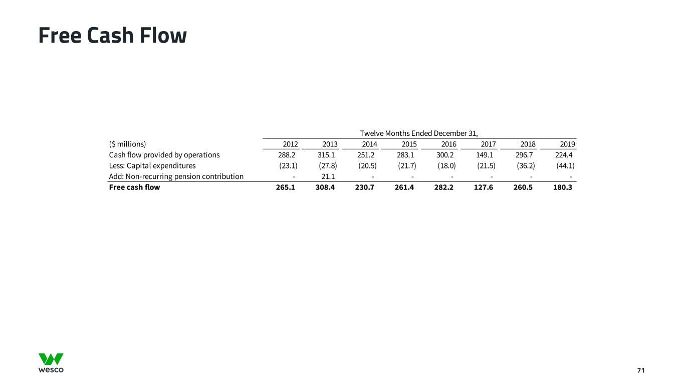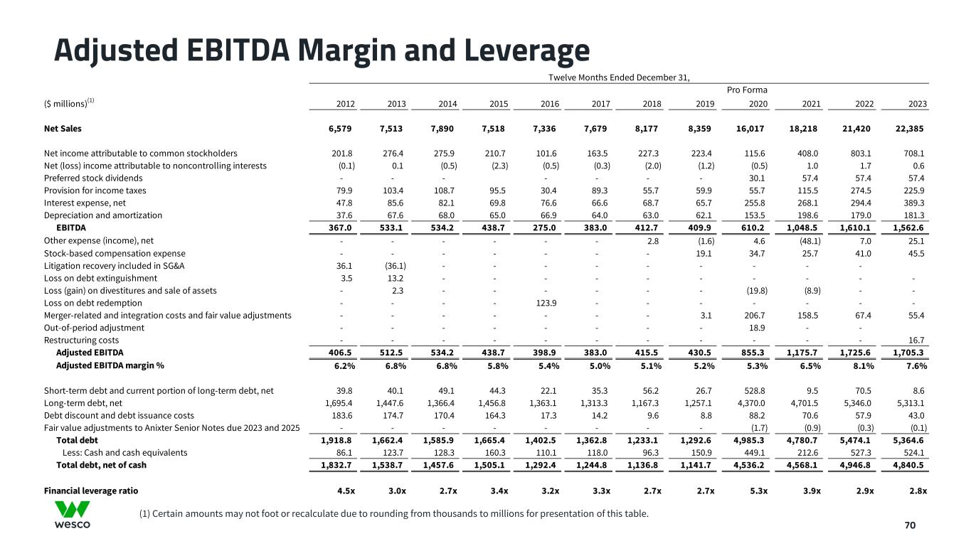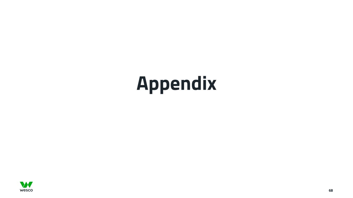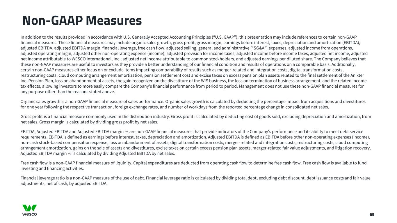 Non-GAAP Measures 69 In addition to the results provided in accordance with U.S. Generally Accepted Accounting Principles (“U.S. GAAP”), this presentation may include references to certain non-GAAP financial measures. These financial measures may include organic sales growth, gross profit, gross margin, earnings before interest, taxes, depreciation and amortization (EBITDA), adjusted EBITDA, adjusted EBITDA margin, financial leverage, free cash flow, adjusted selling, general and administrative (“SG&A”) expenses, adjusted income from operations, adjusted operating margin, adjusted other non-operating expense (income), adjusted provision for income taxes, adjusted income before income taxes, adjusted net income, adjusted net income attributable to WESCO International, Inc., adjusted net income attributable to common stockholders, and adjusted earnings per diluted share. The Company believes that these non-GAAP measures are useful to investors as they provide a better understanding of our financial condition and results of operations on a comparable basis. Additionally, certain non-GAAP measures either focus on or exclude items impacting comparability of results such as merger-related and integration costs, digital transformation costs, restructuring costs, cloud computing arrangement amortization, pension settlement cost and excise taxes on excess pension plan assets related to the final settlement of the Anixter Inc. Pension Plan, loss on abandonment of assets, the gain recognized on the divestiture of the WIS business, the loss on termination of business arrangement, and the related income tax effects, allowing investors to more easily compare the Company's financial performance from period to period. Management does not use these non-GAAP financial measures for any purpose other than the reasons stated above. Organic sales growth is a non-GAAP financial measure of sales performance. Organic sales growth is calculated by deducting the percentage impact from acquisitions and divestitures for one year following the respective transaction, foreign exchange rates, and number of workdays from the reported percentage change in consolidated net sales. Gross profit is a financial measure commonly used in the distribution industry. Gross profit is calculated by deducting cost of goods sold, excluding depreciation and amortization, from net sales. Gross margin is calculated by dividing gross profit by net sales. EBITDA, Adjusted EBITDA and Adjusted EBITDA margin % are non-GAAP financial measures that provide indicators of the Company's performance and its ability to meet debt service requirements. EBITDA is defined as earnings before interest, taxes, depreciation and amortization. Adjusted EBITDA is defined as EBITDA before other non-operating expenses (income), non-cash stock-based compensation expense, loss on abandonment of assets, digital transformation costs, merger-related and integration costs, restructuring costs, cloud computing arrangement amortization, gains on the sale of assets and divestitures, excise taxes on certain excess pension plan assets, merger-related fair value adjustments, and litigation recovery. Adjusted EBITDA margin % is calculated by dividing Adjusted EBITDA by net sales. Free cash flow is a non-GAAP financial measure of liquidity. Capital expenditures are deducted from operating cash flow to determine free cash flow. Free cash flow is available to fund investing and financing activities. Financial leverage ratio is a non-GAAP measure of the use of debt. Financial leverage ratio is calculated by dividing total debt, excluding debt discount, debt issuance costs and fair value adjustments, net of cash, by adjusted EBITDA.