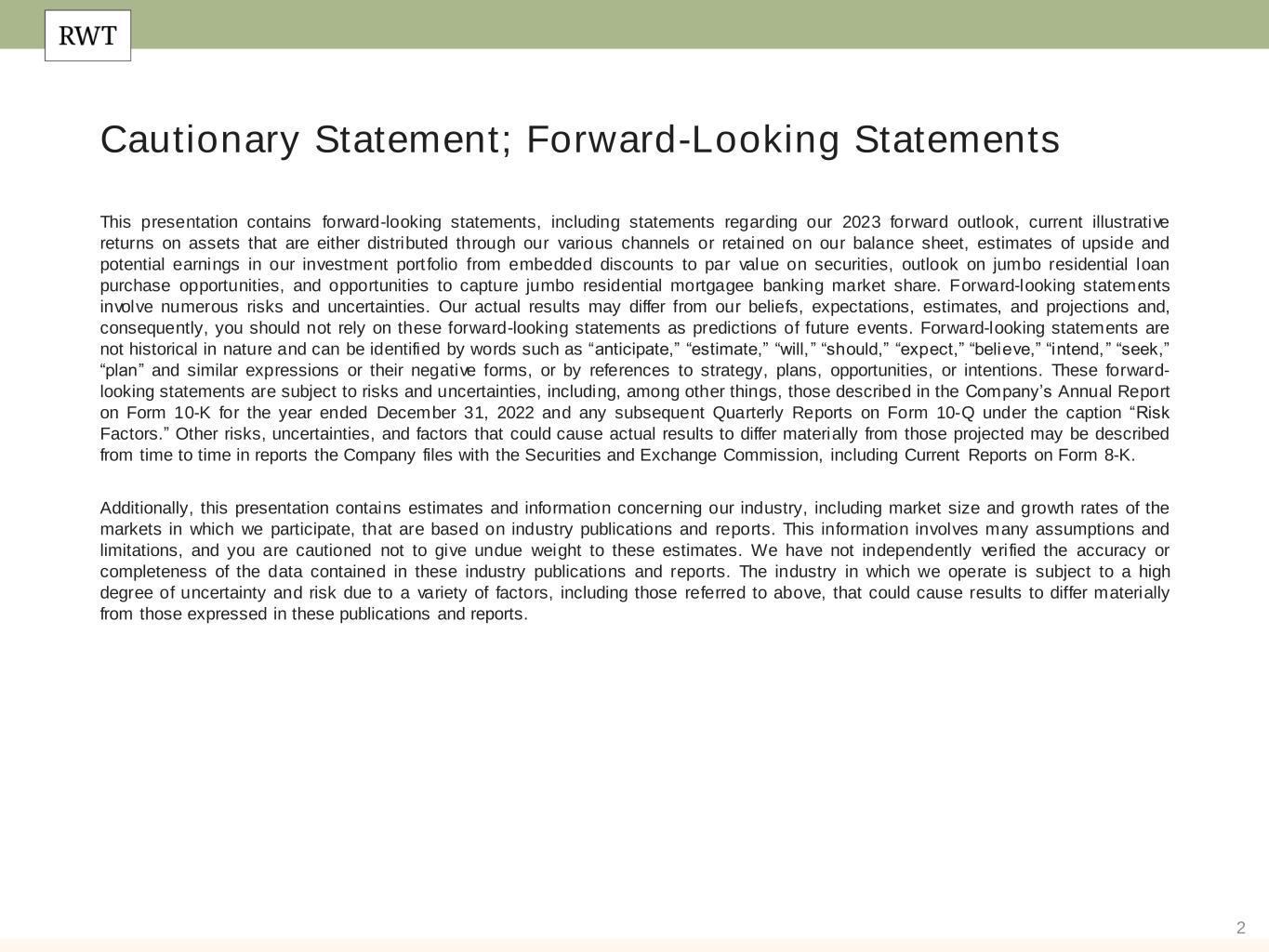2 Cautionary Statement; Forward-Looking Statements This presentation contains forward-looking statements, including statements regarding our 2023 forward outlook, current illustrative returns on assets that are either distributed through our various channels or retained on our balance sheet, estimates of upside and potential earnings in our investment port folio from embedded discounts to par value on securities, outlook on jumbo residential loan purchase opportunities, and opportunities to capture jumbo residential mortgagee banking market share. Forward-looking statements involve numerous risks and uncertainties. Our actual results may differ from our beliefs, expectations, estimates, and projections and, consequently, you should not rely on these forward-looking statements as predictions of future events. Forward-looking statements are not historical in nature and can be identified by words such as “anticipate,” “estimate,” “will, ” “should,” “expect,” “believe,” “intend,” “seek,” “plan” and similar expressions or their negative forms, or by references to strategy, plans, opportunities, or intentions. These forward- looking statements are subject to risks and uncertainties, including, among other things, those described in the Company’s Annual Report on Form 10-K for the year ended December 31, 2022 and any subsequent Quarterly Reports on Form 10-Q under the caption “Risk Factors.” Other risks, uncertainties, and factors that could cause actual results to differ materially from those projected may be described from time to time in reports the Company files with the Securities and Exchange Commission, including Current Reports on Form 8-K. Additionally, this presentation contains estimates and information concerning our industry, including market size and growth rates of the markets in which we participate, that are based on industry publications and reports. This information involves many assumptions and limitations, and you are cautioned not to give undue weight to these estimates. We have not independently verified the accuracy or completeness of the data contained in these industry publications and reports. The industry in which we operate is subject to a high degree of uncertainty and risk due to a variety of factors, including those referred to above, that could cause results to differ materially from those expressed in these publications and reports.