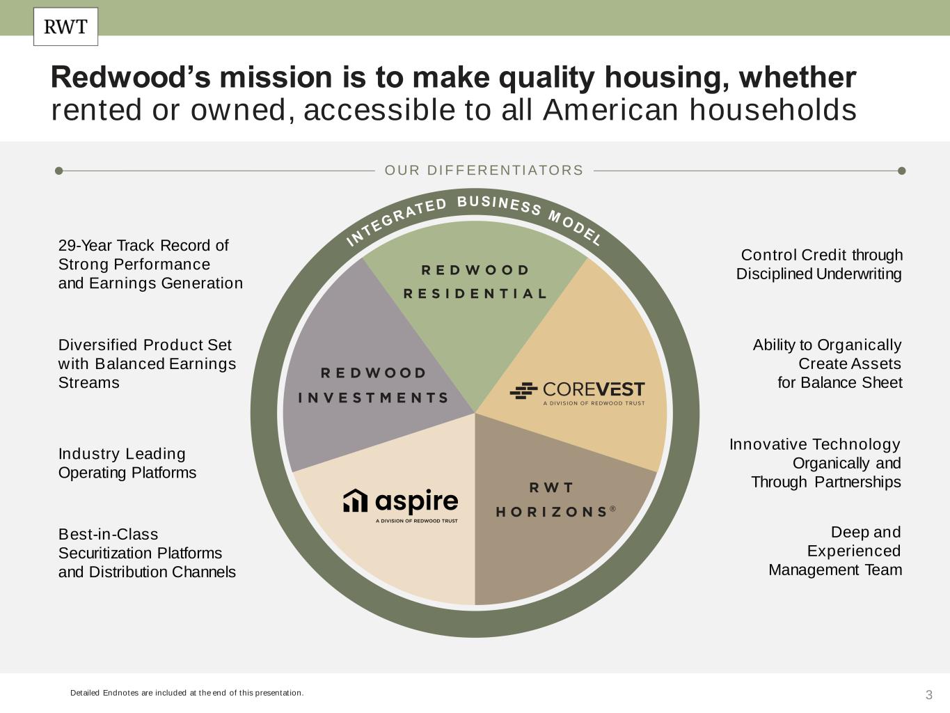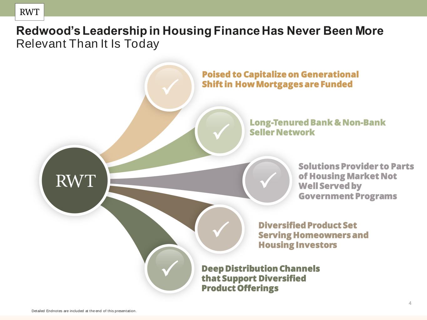 3 Redwood’s mission is to make quality housing, whether rented or owned, accessible to all American households Detailed Endnotes are included at the end of this presentation. 29-Year Track Record of Strong Performance and Earnings Generation Diversified Product Set with Balanced Earnings Streams Industry Leading Operating Platforms Best-in-Class Securitization Platforms and Distribution Channels Control Credit through Disciplined Underwriting Ability to Organically Create Assets for Balance Sheet Innovative Technology Organically and Through Partnerships Deep and Experienced Management Team O UR D I F F ERENTI ATO RS IN TEGRATED BUSI NESS M ODEL ®