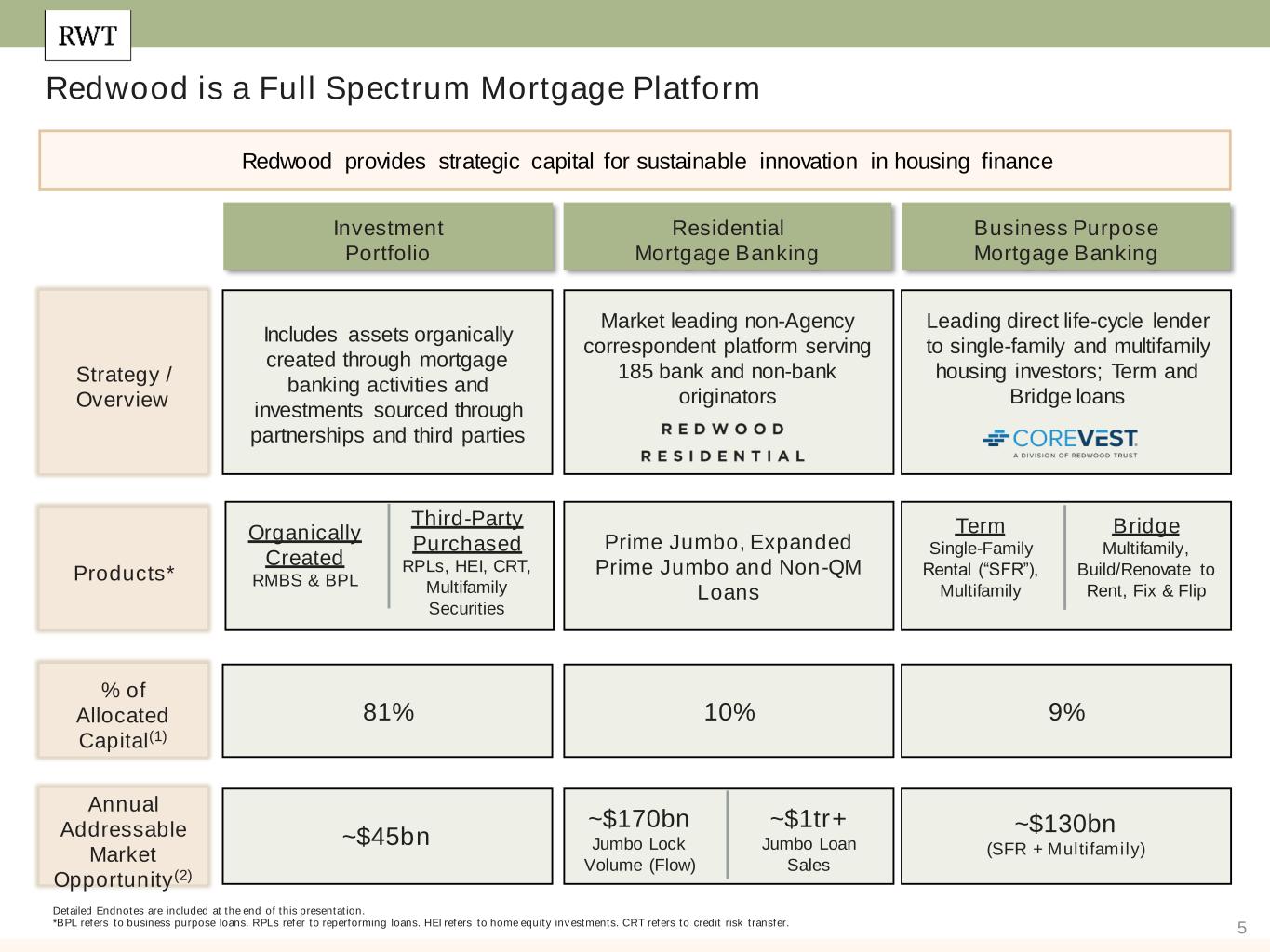 4 Poised to Capitalize on Generational Shift in How Mortgages are Funded Long-Tenured Bank & Non-Bank Seller Network Solutions Provider to Parts of Housing Market Not Well Served by Government Programs Diversified Product Set Serving Homeowners and Housing Investors Deep Distribution Channels that Support Diversified Product Offerings      Redwood’s Leadership in Housing Finance Has Never Been More Relevant Than It Is Today Detailed Endnotes are included at the end of this presentation.
