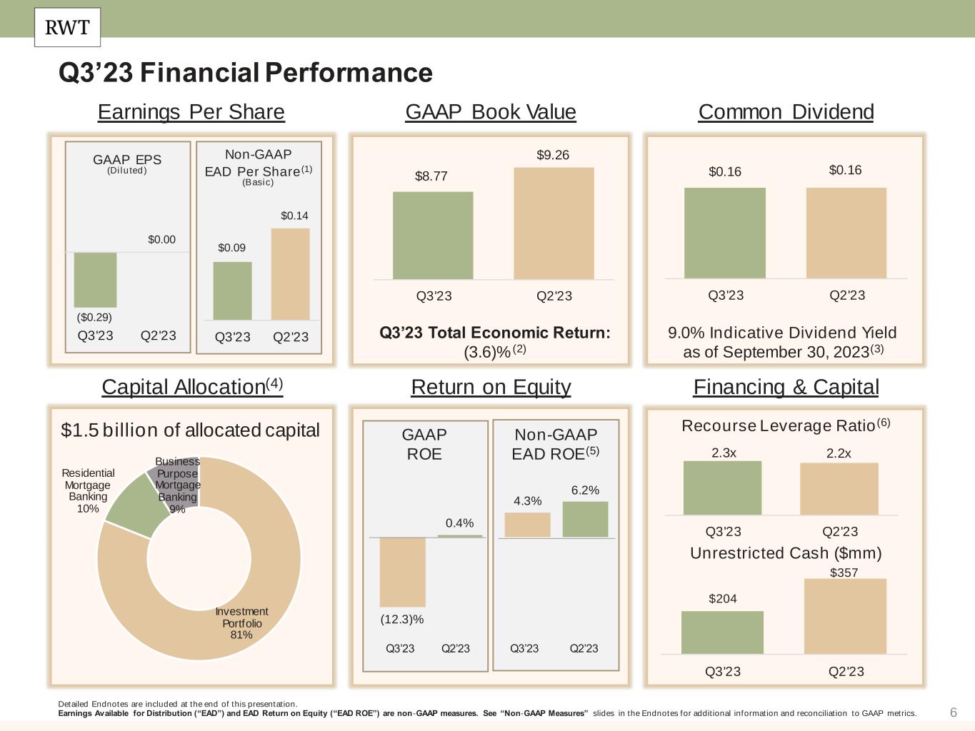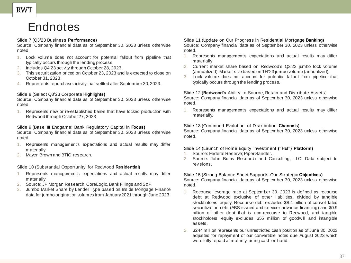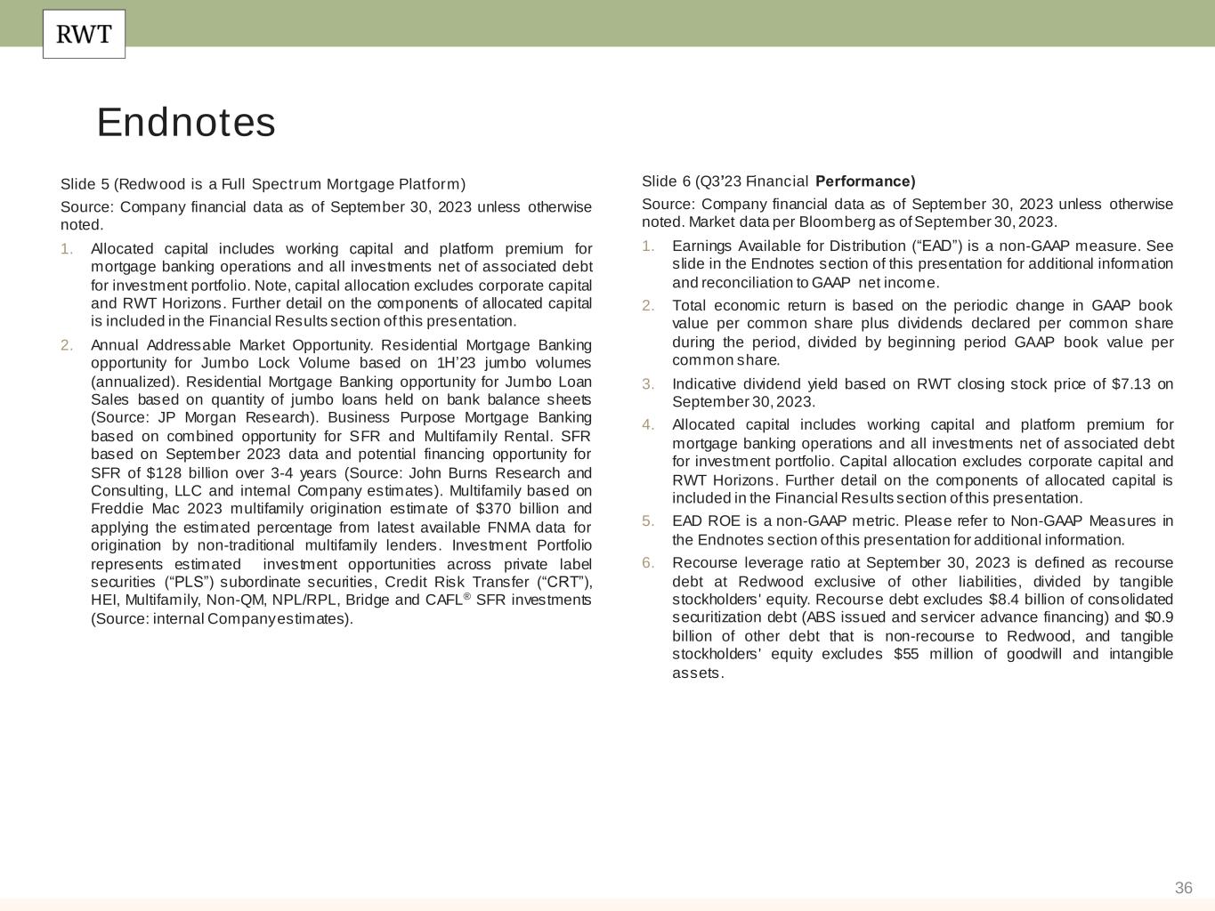 36 Slide 5 (Redwood is a Full Spectrum Mortgage Platform) Source: Company financial data as of September 30, 2023 unless otherwise noted. 1. Allocated capital includes working capital and platform premium for mortgage banking operations and all investments net of associated debt for investment portfolio. Note, capital allocation excludes corporate capital and RWT Horizons. Further detail on the components of allocated capital is included in the Financial Results section of this presentation. 2. Annual Addressable Market Opportunity. Residential Mortgage Banking opportunity for Jumbo Lock Volume based on 1H’23 jumbo volumes (annualized). Residential Mortgage Banking opportunity for Jumbo Loan Sales based on quantity of jumbo loans held on bank balance sheets (Source: JP Morgan Research). Business Purpose Mortgage Banking based on combined opportunity for SFR and Multifamily Rental. SFR based on September 2023 data and potential financing opportunity for SFR of $128 billion over 3-4 years (Source: John Burns Research and Consulting, LLC and internal Company estimates). Multifamily based on Freddie Mac 2023 multifamily origination estimate of $370 billion and applying the estimated percentage from latest available FNMA data for origination by non-traditional multifamily lenders. Investment Portfolio represents estimated investment opportunities across private label securities (“PLS”) subordinate securities, Credit Risk Transfer (“CRT”), HEI, Multifamily, Non-QM, NPL/RPL, Bridge and CAFL® SFR investments (Source: internal Company estimates). Endnotes Slide 6 (Q3’23 Financial Performance)​ Source: Company financial data as of September 30, 2023 unless otherwise noted. Market data per Bloomberg as of September 30, 2023. 1. Earnings Available for Distribution (“EAD”) is a non-GAAP measure. See slide in the Endnotes section of this presentation for additional information and reconciliation to GAAP net income. 2. Total economic return is based on the periodic change in GAAP book value per common share plus dividends declared per common share during the period, divided by beginning period GAAP book value per common share. 3. Indicative dividend yield based on RWT closing stock price of $7.13 on September 30, 2023. 4. Allocated capital includes working capital and platform premium for mortgage banking operations and all investments net of associated debt for investment portfolio. Capital allocation excludes corporate capital and RWT Horizons. Further detail on the components of allocated capital is included in the Financial Results section of this presentation. 5. EAD ROE is a non-GAAP metric. Please refer to Non-GAAP Measures in the Endnotes section of this presentation for additional information. 6. Recourse leverage ratio at September 30, 2023 is defined as recourse debt at Redwood exclusive of other liabilities, divided by tangible stockholders' equity. Recourse debt excludes $8.4 billion of consolidated securitization debt (ABS issued and servicer advance financing) and $0.9 billion of other debt that is non-recourse to Redwood, and tangible stockholders' equity excludes $55 million of goodwill and intangible assets.