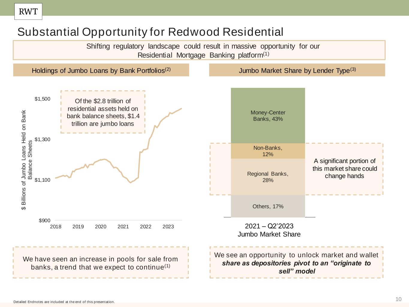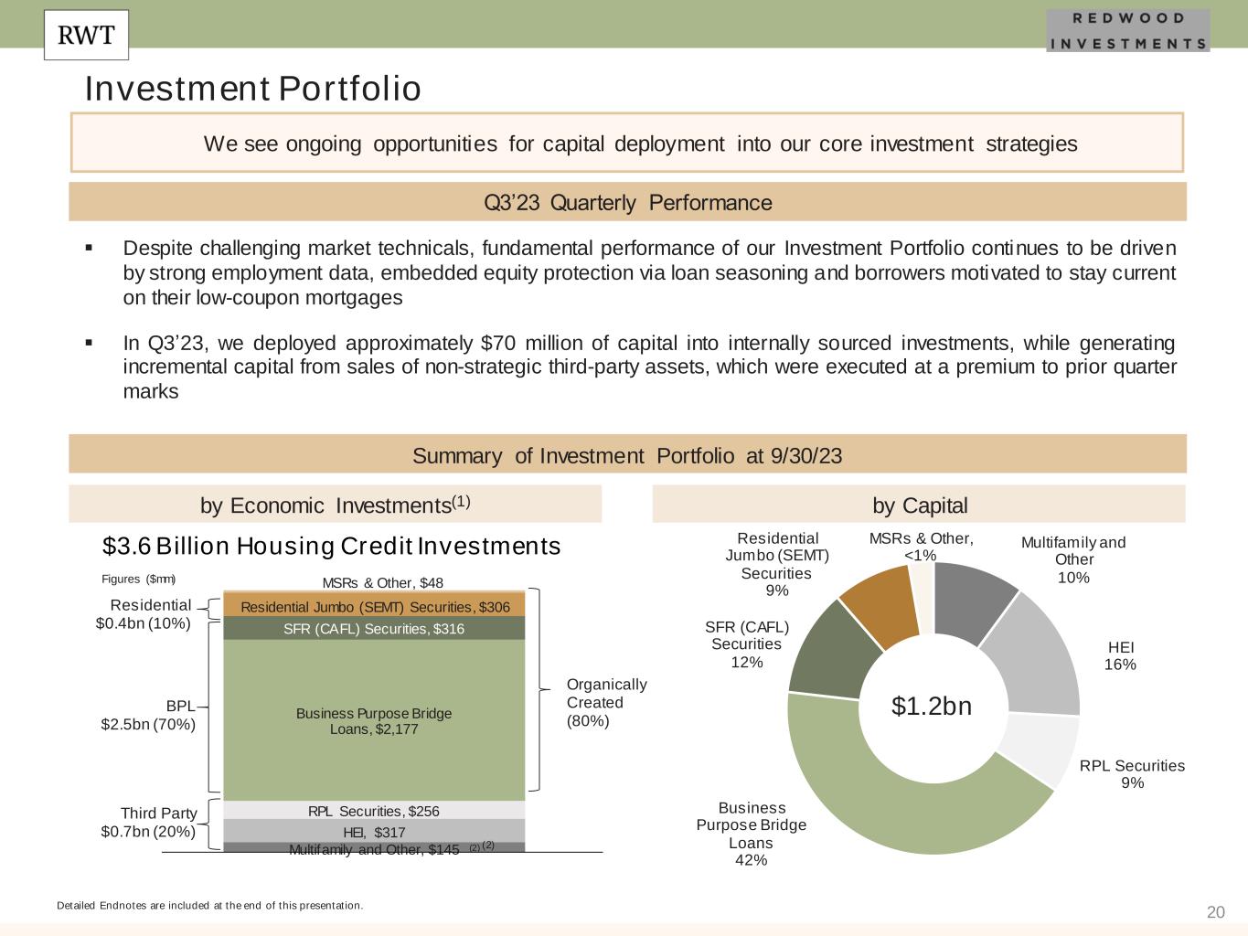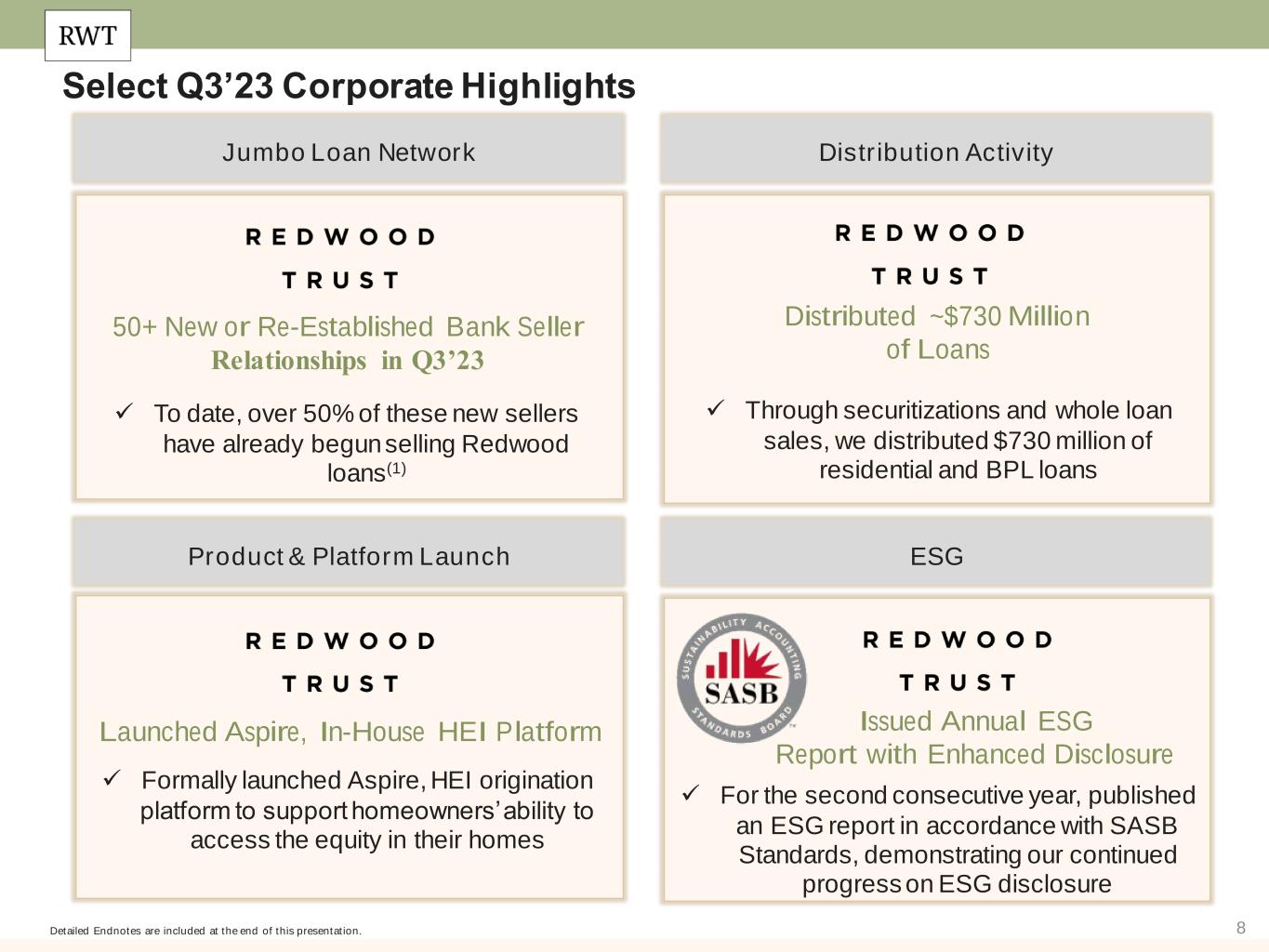 36 Slide 5 (Redwood is a Full Spectrum Mortgage Platform) Source: Company financial data as of September 30, 2023 unless otherwise noted. 1. Allocated capital includes working capital and platform premium for mortgage banking operations and all investments net of associated debt for investment portfolio. Note, capital allocation excludes corporate capital and RWT Horizons. Further detail on the components of allocated capital is included in the Financial Results section of this presentation. 2. Annual Addressable Market Opportunity. Residential Mortgage Banking opportunity for Jumbo Lock Volume based on 1H’23 jumbo volumes (annualized). Residential Mortgage Banking opportunity for Jumbo Loan Sales based on quantity of jumbo loans held on bank balance sheets (Source: JP Morgan Research). Business Purpose Mortgage Banking based on combined opportunity for SFR and Multifamily Rental. SFR based on September 2023 data and potential financing opportunity for SFR of $128 billion over 3-4 years (Source: John Burns Research and Consulting, LLC and internal Company estimates). Multifamily based on Freddie Mac 2023 multifamily origination estimate of $370 billion and applying the estimated percentage from latest available FNMA data for origination by non-traditional multifamily lenders. Investment Portfolio represents estimated investment opportunities across private label securities (“PLS”) subordinate securities, Credit Risk Transfer (“CRT”), HEI, Multifamily, Non-QM, NPL/RPL, Bridge and CAFL® SFR investments (Source: internal Company estimates). Endnotes Slide 6 (Q3’23 Financial Performance)​ Source: Company financial data as of September 30, 2023 unless otherwise noted. Market data per Bloomberg as of September 30, 2023. 1. Earnings Available for Distribution (“EAD”) is a non-GAAP measure. See slide in the Endnotes section of this presentation for additional information and reconciliation to GAAP net income. 2. Total economic return is based on the periodic change in GAAP book value per common share plus dividends declared per common share during the period, divided by beginning period GAAP book value per common share. 3. Indicative dividend yield based on RWT closing stock price of $7.13 on September 30, 2023. 4. Allocated capital includes working capital and platform premium for mortgage banking operations and all investments net of associated debt for investment portfolio. Capital allocation excludes corporate capital and RWT Horizons. Further detail on the components of allocated capital is included in the Financial Results section of this presentation. 5. EAD ROE is a non-GAAP metric. Please refer to Non-GAAP Measures in the Endnotes section of this presentation for additional information. 6. Recourse leverage ratio at September 30, 2023 is defined as recourse debt at Redwood exclusive of other liabilities, divided by tangible stockholders' equity. Recourse debt excludes $8.4 billion of consolidated securitization debt (ABS issued and servicer advance financing) and $0.9 billion of other debt that is non-recourse to Redwood, and tangible stockholders' equity excludes $55 million of goodwill and intangible assets.