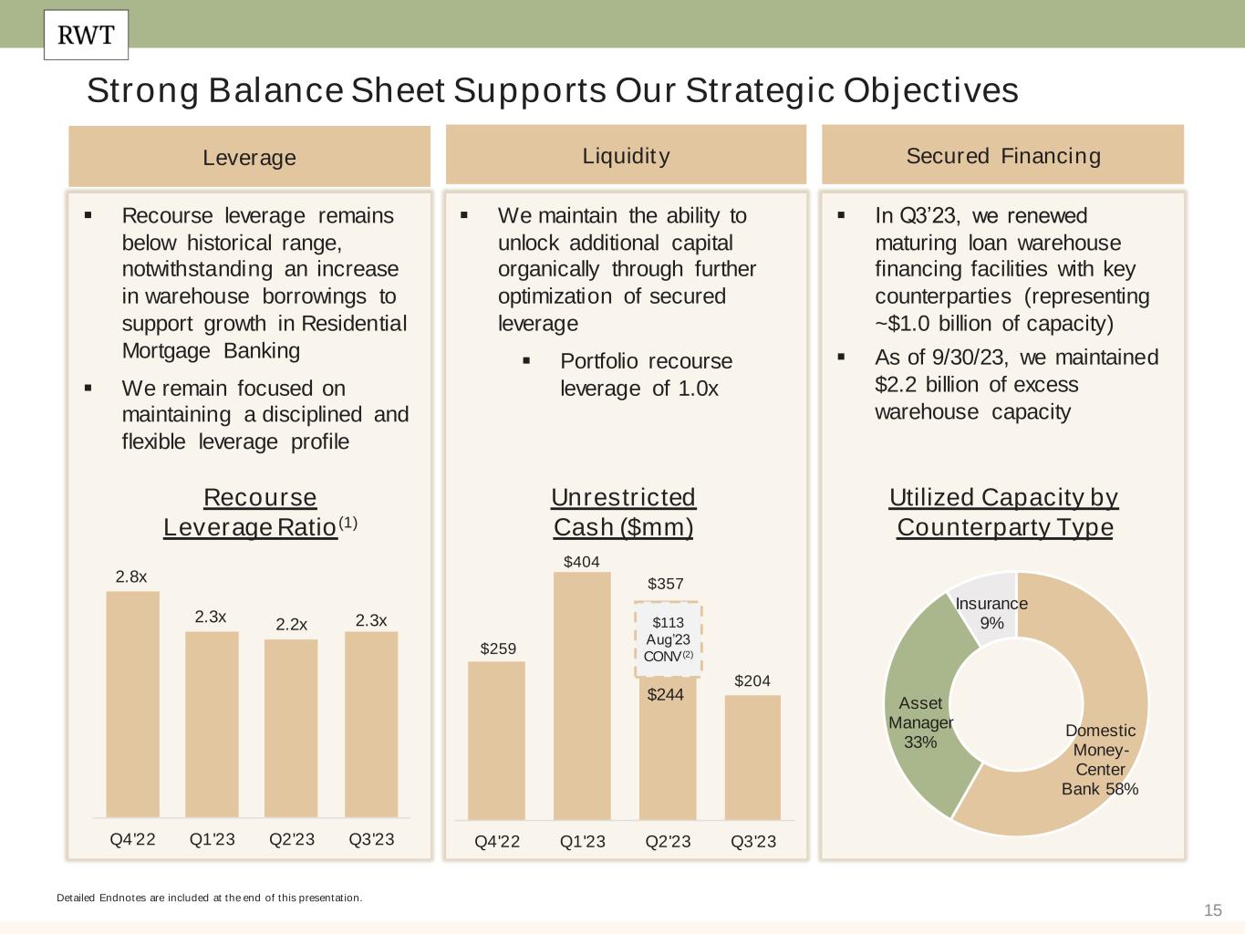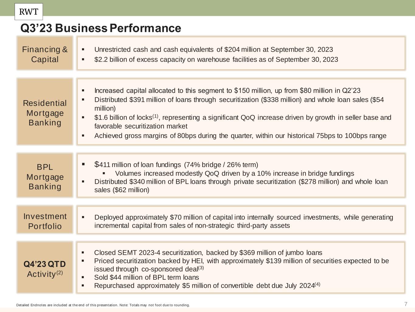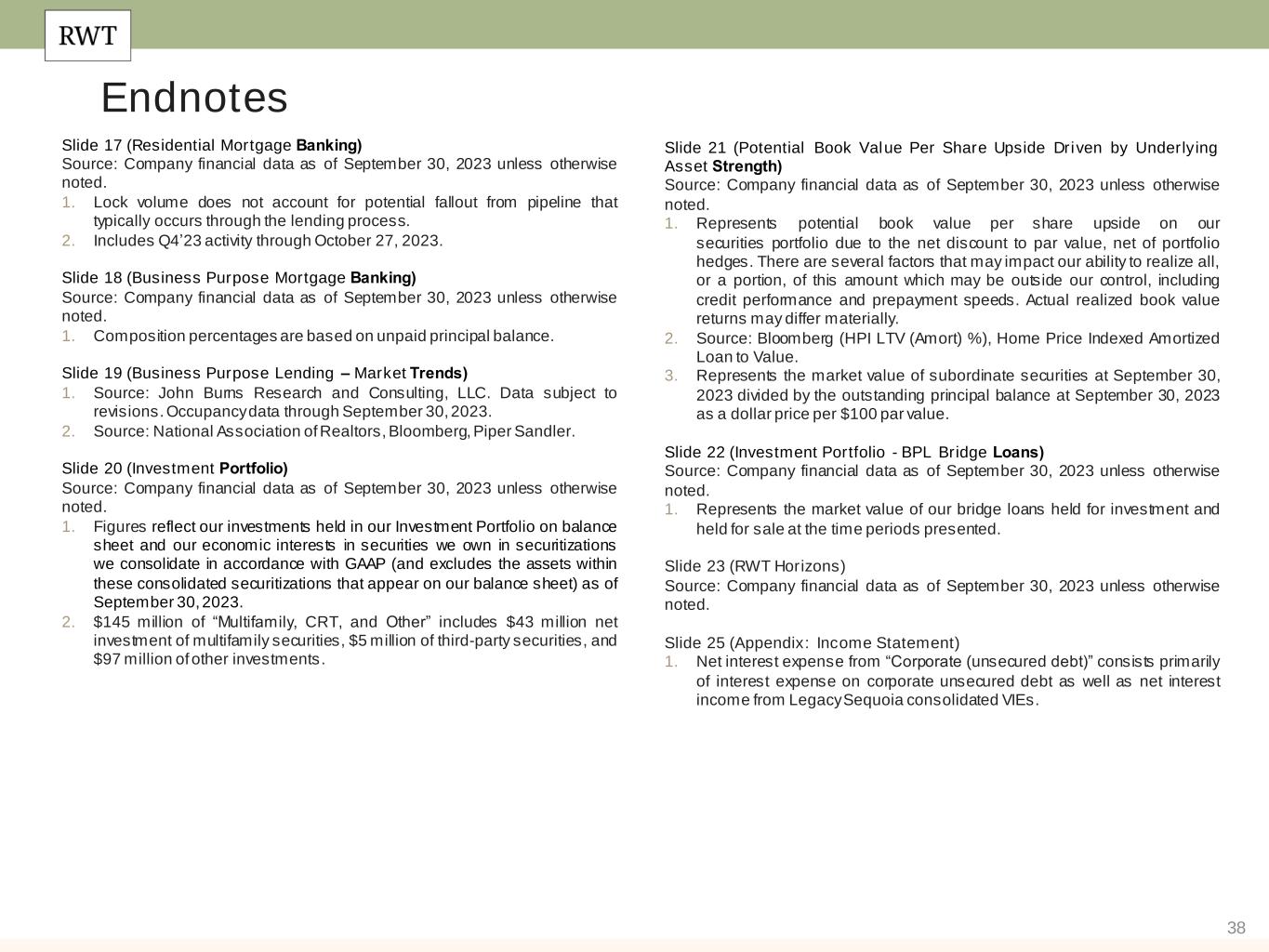 38 Endnotes Slide 17 (Residential Mortgage Banking)​ Source: Company financial data as of September 30, 2023 unless otherwise noted. 1. Lock volume does not account for potential fallout from pipeline that typically occurs through the lending process. 2. Includes Q4’23 activity through October 27, 2023. Slide 18 (Business Purpose Mortgage Banking)​ Source: Company financial data as of September 30, 2023 unless otherwise noted. 1. Composition percentages are based on unpaid principal balance. Slide 19 (Business Purpose Lending – Market Trends)​ 1. Source: John Burns Research and Consulting, LLC. Data subject to revisions. Occupancy data through September 30, 2023. 2. Source: National Association of Realtors, Bloomberg, Piper Sandler. Slide 20 (Investment Portfolio)​ Source: Company financial data as of September 30, 2023 unless otherwise noted. 1. Figures reflect our investments held in our Investment Portfolio on balance sheet and our economic interests in securities we own in securitizations we consolidate in accordance with GAAP (and excludes the assets within these consolidated securitizations that appear on our balance sheet) as of September 30, 2023. 2. $145 million of “Multifamily, CRT, and Other” includes $43 million net investment of multifamily securities, $5 million of third-party securities, and $97 million of other investments. Slide 21 (Potential Book Value Per Share Upside Driven by Underlying Asset Strength)​ Source: Company financial data as of September 30, 2023 unless otherwise noted. 1. Represents potential book value per share upside on our securities portfolio due to the net discount to par value, net of portfolio hedges. There are several factors that may impact our ability to realize all, or a portion, of this amount which may be outside our control, including credit performance and prepayment speeds. Actual realized book value returns may differ materially. 2. Source: Bloomberg (HPI LTV (Amort) %), Home Price Indexed Amortized Loan to Value. 3. Represents the market value of subordinate securities at September 30, 2023 divided by the outstanding principal balance at September 30, 2023 as a dollar price per $100 par value. Slide 22 (Investment Portfolio - BPL Bridge Loans)​ Source: Company financial data as of September 30, 2023 unless otherwise noted. 1. Represents the market value of our bridge loans held for investment and held for sale at the time periods presented. Slide 23 (RWT Horizons) Source: Company financial data as of September 30, 2023 unless otherwise noted. Slide 25 (Appendix: Income Statement) 1. Net interest expense from “Corporate (unsecured debt)” consists primarily of interest expense on corporate unsecured debt as well as net interest income from Legacy Sequoia consolidated VIEs.