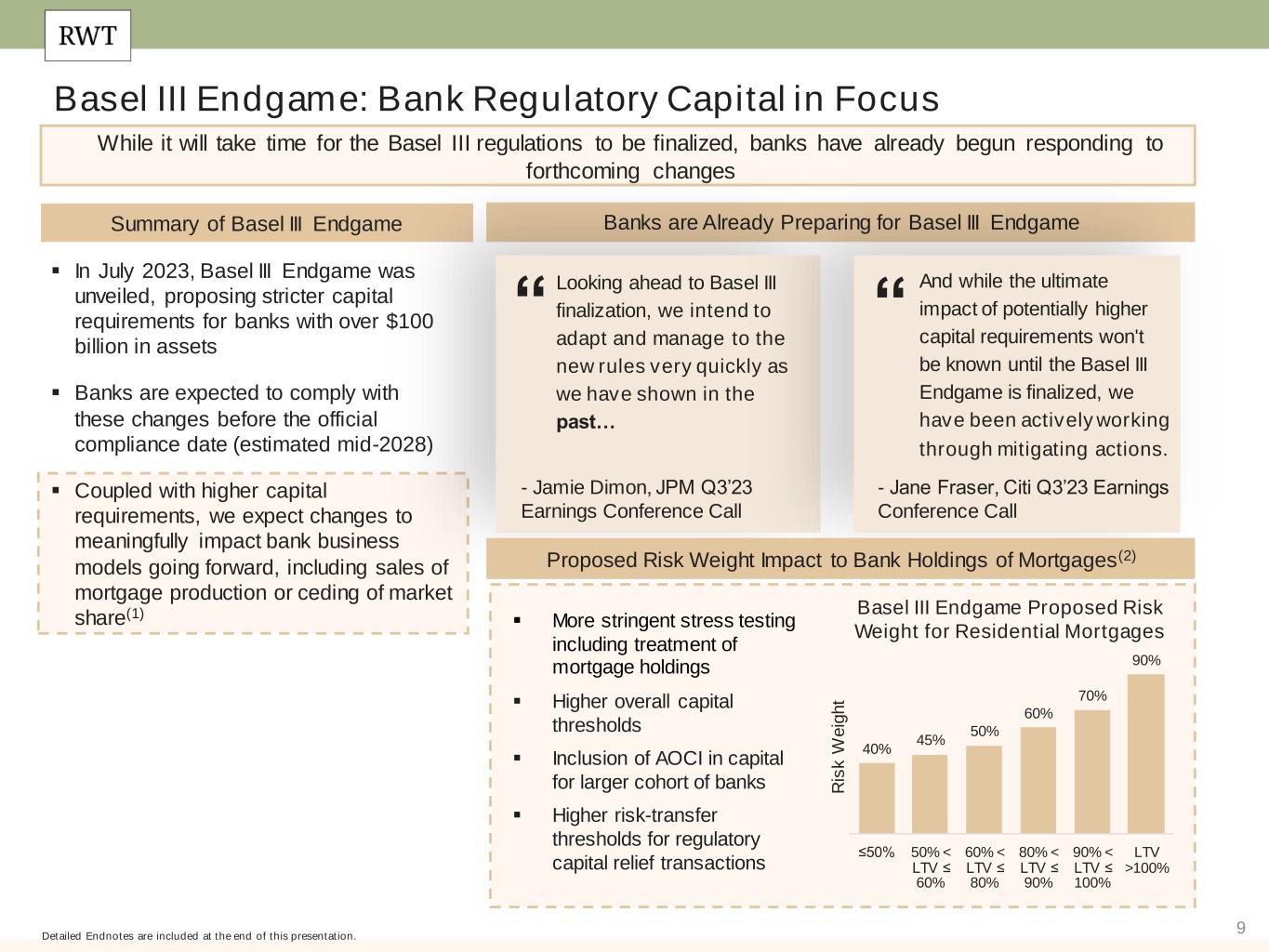 9 Basel III Endgame: Bank Regulatory Capital in Focus Detailed Endnotes are included at the end of this presentation. While it will take time for the Basel III regulations to be finalized, banks have already begun responding to forthcoming changes Summary of Basel III Endgame Banks are Already Preparing for Basel III Endgame Looking ahead to Basel III finalization, we intend to adapt and manage to the new rules very quickly as we have shown in the past… “ - Jamie Dimon, JPM Q3’23 Earnings Conference Call And while the ultimate impact of potentially higher capital requirements won't be known until the Basel III Endgame is finalized, we have been actively working through mitigating actions. “ - Jane Fraser, Citi Q3’23 Earnings Conference Call Proposed Risk Weight Impact to Bank Holdings of Mortgages(2) ▪ More stringent stress testing including treatment of mortgage holdings ▪ Higher overall capital thresholds ▪ Inclusion of AOCI in capital for larger cohort of banks ▪ Higher risk-transfer thresholds for regulatory capital relief transactions 40% 45% 50% 60% 70% 90% ≤50% 50% < LTV ≤ 60% 60% < LTV ≤ 80% 80% < LTV ≤ 90% 90% < LTV ≤ 100% LTV >100% R is k W e ig h t Basel III Endgame Proposed Risk Weight for Residential Mortgages ▪ In July 2023, Basel III Endgame was unveiled, proposing stricter capital requirements for banks with over $100 billion in assets ▪ Banks are expected to comply with these changes before the official compliance date (estimated mid-2028) ▪ Coupled with higher capital requirements, we expect changes to meaningfully impact bank business models going forward, including sales of mortgage production or ceding of market share(1)