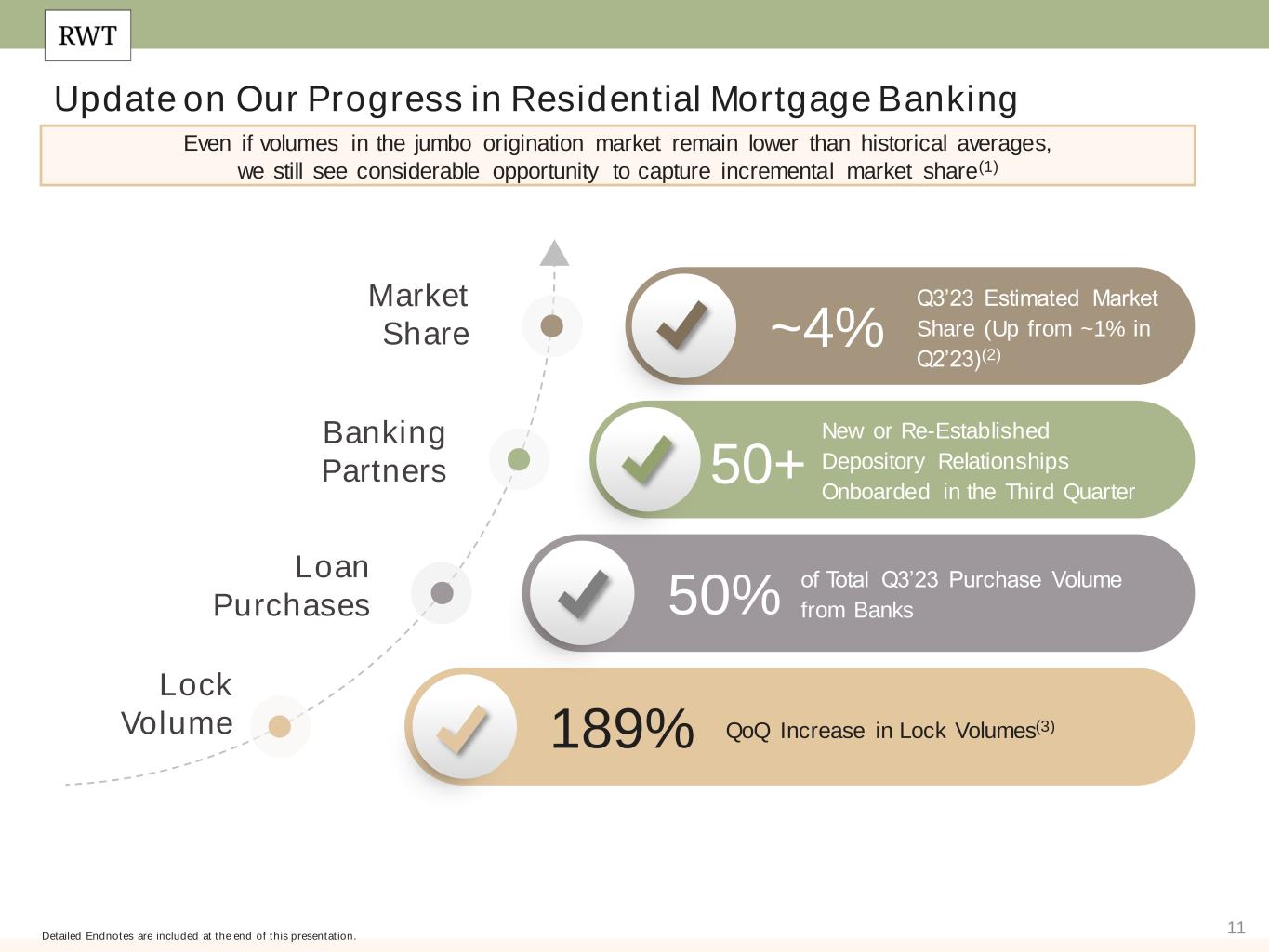 10 Substantial Opportunity for Redwood Residential Detailed Endnotes are included at the end of this presentation. Shifting regulatory landscape could result in massive opportunity for our Residential Mortgage Banking platform(1) Jumbo Market Share by Lender Type(3) A significant portion of this market share could change hands Holdings of Jumbo Loans by Bank Portfolios(2) We have seen an increase in pools for sale from banks, a trend that we expect to continue(1) We see an opportunity to unlock market and wallet share as depositories pivot to an “originate to sell” model $900 $1,100 $1,300 $1,500 2018 2019 2020 2021 2022 2023 $ B ill io n s o f Ju m b o L o a n s H e ld o n B a n k B a la n c e S h e e ts Of the $2.8 trillion of residential assets held on bank balance sheets, $1.4 trillion are jumbo loans 2021 – Q2’2023 Jumbo Market Share Others, 17% Regional Banks, 28% Non-Banks, 12% Money-Center Banks, 43%