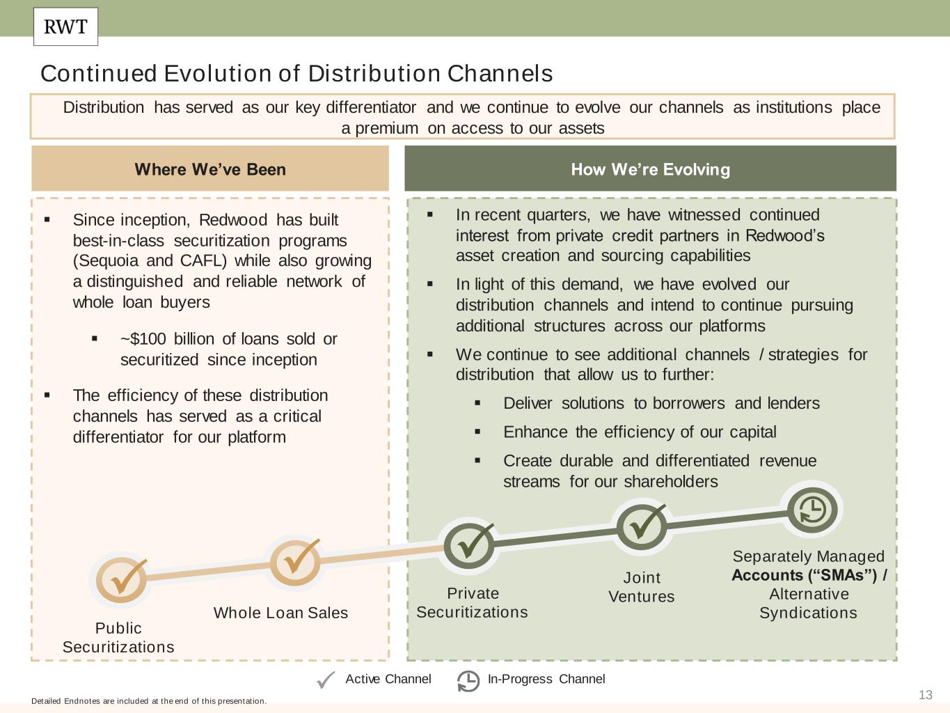 12 Asset Creation + Fee-Based Revenue Through our operating businesses (Residential and Business Purpose Mortgage Banking) we organically create assets that are either distributed through our various channels or retained on our balance sheet Redwood’s Ability to Source, Retain and Distribute Assets Detailed Endnotes are included at the end of this presentation. We play an integral role in providing liquidity to the housing market while sourcing and retaining assets for our investors and our own portfolio Asset Distribution Asset Retention • Asset distribution of our mortgage banking products generates: – Origination Fees – Gain on Sale – Asset Management Fees – Ancillary Fees – Warehouse Interest Income 15-20%+ Current Illustrative Returns(1) ✓ Securitization ✓ Whole Loan Sales ✓ Managed Funds / Joint Ventures • Asset retention of our organically created assets generates: – Net Interest Income – Risk Adjusted Returns ~12-18% Current Illustrative Returns(1) ✓ Residential Subordinate RMBS ✓ Interest-Only RMBS ✓ SFR Term Subordinate MBS ✓ SFR Term Interest-Only MBS ✓ Bridge Loans ✓ MSRs