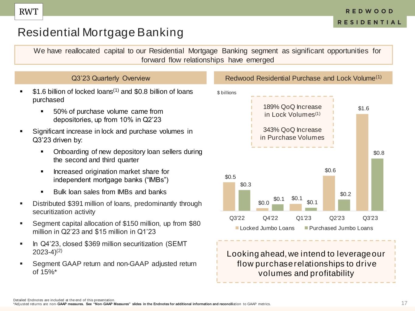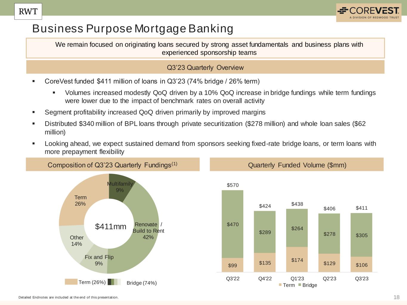 17 ▪ $1.6 billion of locked loans(1) and $0.8 billion of loans purchased ▪ 50% of purchase volume came from depositories, up from 10% in Q2’23 ▪ Significant increase in lock and purchase volumes in Q3’23 driven by: ▪ Onboarding of new depository loan sellers during the second and third quarter ▪ Increased origination market share for independent mortgage banks (“IMBs”) ▪ Bulk loan sales from IMBs and banks ▪ Distributed $391 million of loans, predominantly through securitization activity ▪ Segment capital allocation of $150 million, up from $80 million in Q2’23 and $15 million in Q1’23 ▪ In Q4’23, closed $369 million securitization (SEMT 2023-4)(2) ▪ Segment GAAP return and non-GAAP adjusted return of 15%* Residential Mortgage Banking Q3’23 Quarterly Overview We have reallocated capital to our Residential Mortgage Banking segment as significant opportunities for forward flow relationships have emerged $ billions Looking ahead, we intend to leverage our flow purchase relationships to drive volumes and profitability Redwood Residential Purchase and Lock Volume(1) Detailed Endnotes are included at the end of this presentation. *Adjusted returns are non-GAAP measures. See “Non-GAAP Measures” slides in the Endnotes for additional information and reconciliation to GAAP metrics. $0.5 $0.0 $0.1 $0.6 $1.6 $0.3 $0.1 $0.1 $0.2 $0.8 Q3'22 Q4'22 Q1'23 Q2'23 Q3'23 Locked Jumbo Loans Purchased Jumbo Loans 189% QoQ Increase in Lock Volumes(1) 343% QoQ Increase in Purchase Volumes
