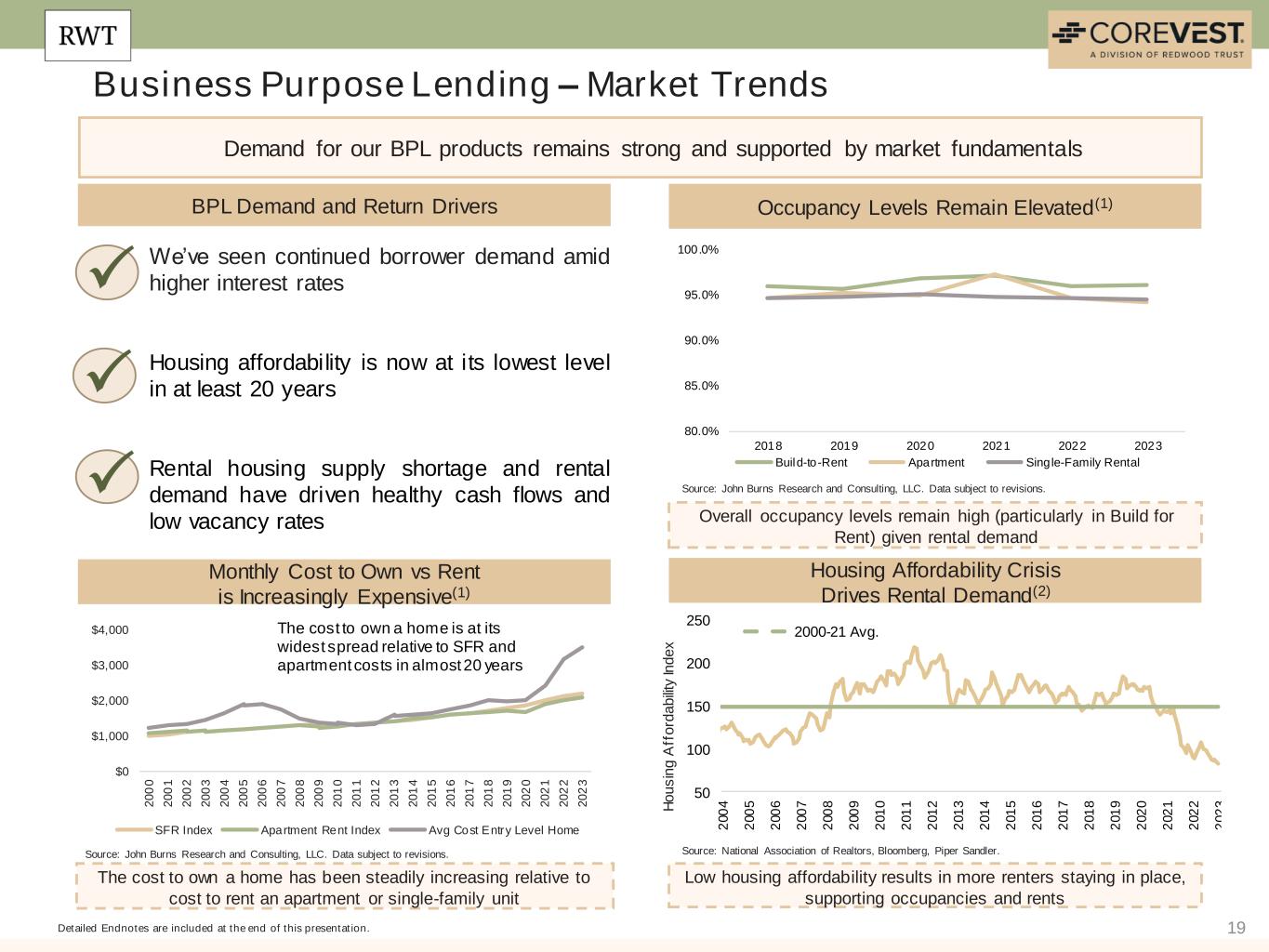 18 Business Purpose Mortgage Banking Q3’23 Quarterly Overview Composition of Q3’23 Quarterly Fundings(1) Detailed Endnotes are included at the end of this presentation. We remain focused on originating loans secured by strong asset fundamentals and business plans with experienced sponsorship teams Quarterly Funded Volume ($mm) Term (26%) Bridge (74%) ▪ CoreVest funded $411 million of loans in Q3’23 (74% bridge / 26% term) ▪ Volumes increased modestly QoQ driven by a 10% QoQ increase in bridge fundings while term fundings were lower due to the impact of benchmark rates on overall activity ▪ Segment profitability increased QoQ driven primarily by improved margins ▪ Distributed $340 million of BPL loans through private securitization ($278 million) and whole loan sales ($62 million) ▪ Looking ahead, we expect sustained demand from sponsors seeking fixed-rate bridge loans, or term loans with more prepayment flexibility $411mm $99 $135 $174 $129 $106 $470 $289 $264 $278 $305 $570 $424 $438 $406 $411 Q3'22 Q4'22 Q1'23 Q2'23 Q3'23 Term Bridge Multifamily 9% Renovate / Build to Rent 42% Fix and Flip 9% Other 14% Term 26%