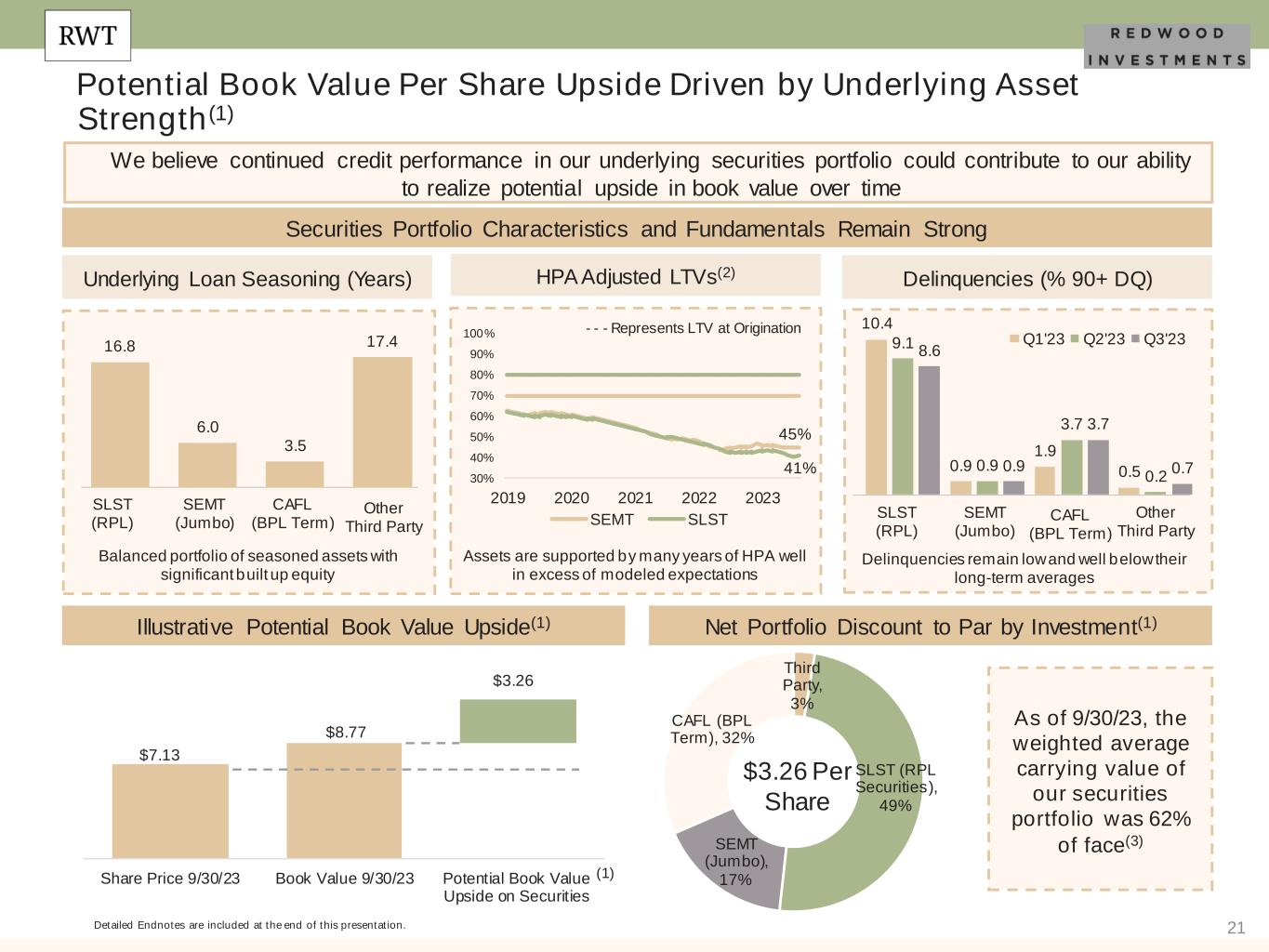 20 Multifamily and Other, $145 HEI, $317 RPL Securities, $256 Business Purpose Bridge Loans, $2,177 SFR (CAFL) Securities, $316 Residential Jumbo (SEMT) Securities, $306 MSRs & Other, $48 Investment Portfolio Q3’23 Quarterly Performance $3.6 Billion Housing Credit Investments Organically Created (80%) Detailed Endnotes are included at the end of this presentation. We see ongoing opportunities for capital deployment into our core investment strategies $1.2bn Third Party $0.7bn (20%) BPL $2.5bn (70%) Residential $0.4bn (10%) Figures ($mm) Summary of Investment Portfolio at 9/30/23 by Economic Investments(1) by Capital (2) ▪ Despite challenging market technicals, fundamental performance of our Investment Portfolio continues to be driven by strong employment data, embedded equity protection via loan seasoning and borrowers motivated to stay current on their low-coupon mortgages ▪ In Q3’23, we deployed approximately $70 million of capital into internally sourced investments, while generating incremental capital from sales of non-strategic third-party assets, which were executed at a premium to prior quarter marks Multifamily and Other 10% HEI 16% RPL Securities 9% Business Purpose Bridge Loans 42% SFR (CAFL) Securities 12% Residential Jumbo (SEMT) Securities 9% MSRs & Other, <1% (2)