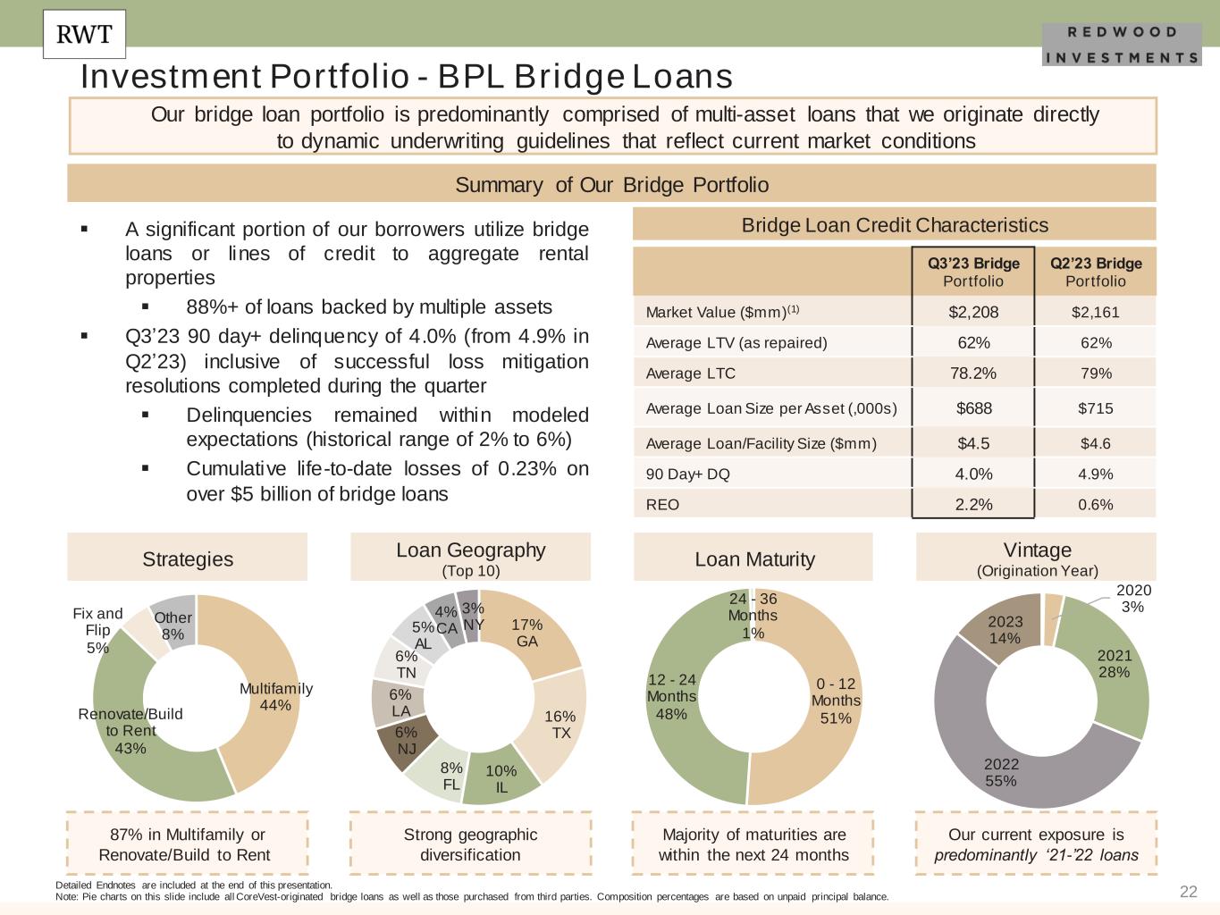 22 Investment Portfolio - BPL Bridge Loans Detailed Endnotes are included at the end of this presentation. Note: Pie charts on this slide include all CoreVest-originated bridge loans as well as those purchased from third parties. Composition percentages are based on unpaid principal balance. Our bridge loan portfolio is predominantly comprised of multi-asset loans that we originate directly to dynamic underwriting guidelines that reflect current market conditions ▪ A significant portion of our borrowers utilize bridge loans or lines of credit to aggregate rental properties ▪ 88%+ of loans backed by multiple assets ▪ Q3’23 90 day+ delinquency of 4.0% (from 4.9% in Q2’23) inclusive of successful loss mitigation resolutions completed during the quarter ▪ Delinquencies remained within modeled expectations (historical range of 2% to 6%) ▪ Cumulative life-to-date losses of 0.23% on over $5 billion of bridge loans Vintage (Origination Year) Our current exposure is predominantly ‘21-’22 loans Loan Maturity Majority of maturities are within the next 24 months Summary of Our Bridge Portfolio Bridge Loan Credit Characteristics Q3’23 Bridge Portfolio Q2’23 Bridge Portfolio Market Value ($mm)(1) $2,208 $2,161 Average LTV (as repaired) 62% 62% Average LTC 78.2% 79% Average Loan Size per Asset (,000s) $688 $715 Average Loan/Facility Size ($mm) $4.5 $4.6 90 Day+ DQ 4.0% 4.9% REO 2.2% 0.6% Strategies Loan Geography (Top 10) Strong geographic diversification 87% in Multifamily or Renovate/Build to Rent Multifamily 44% Renovate/Build to Rent 43% Fix and Flip 5% Other 8% 17% GA 16% TX 10% IL 8% FL 6% NJ 6% LA 6% TN 5% AL 4% CA 3% NY 0 - 12 Months 51% 12 - 24 Months 48% 24 - 36 Months 1% 2020 3% 2021 28% 2022 55% 2023 14%