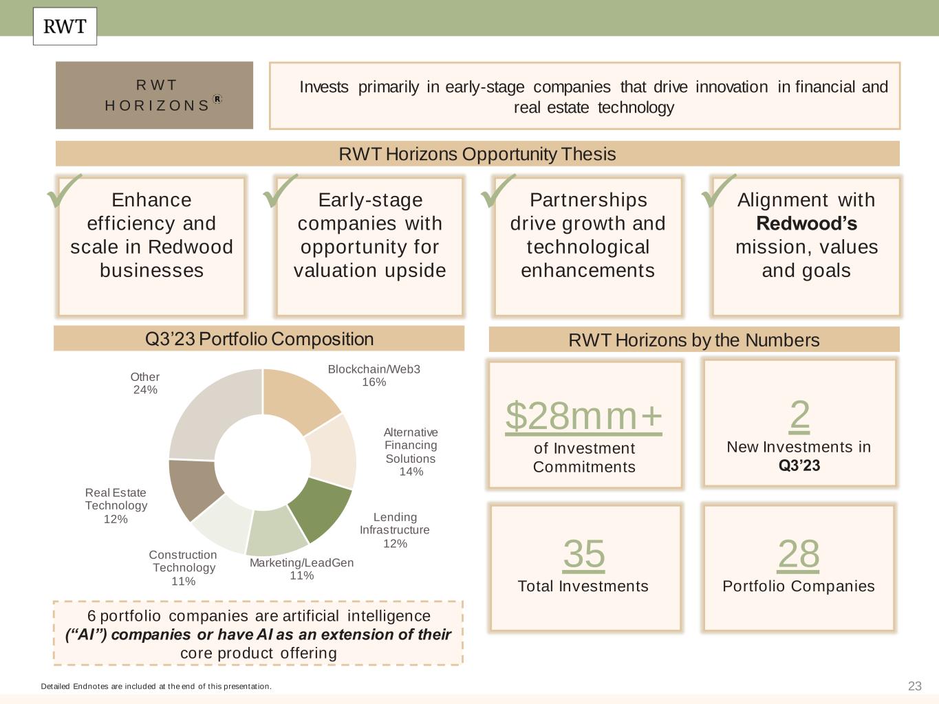 23 R W T H O R I Z O N S RWT Horizons by the Numbers Detailed Endnotes are included at the end of this presentation. Invests primarily in early-stage companies that drive innovation in financial and real estate technology RWT Horizons Opportunity Thesis Enhance efficiency and scale in Redwood businesses Early-stage companies with opportunity for valuation upside Partnerships drive growth and technological enhancements Alignment with Redwood’s mission, values and goals     $28mm+ of Investment Commitments 35 Total Investments 28 Portfolio Companies Q3’23 Portfolio Composition 2 New Investments in Q3’23 Blockchain/Web3 16% Alternative Financing Solutions 14% Lending Infrastructure 12% Marketing/LeadGen 11% Construction Technology 11% Real Estate Technology 12% Other 24% 6 portfolio companies are artificial intelligence (“AI”) companies or have AI as an extension of their core product offering