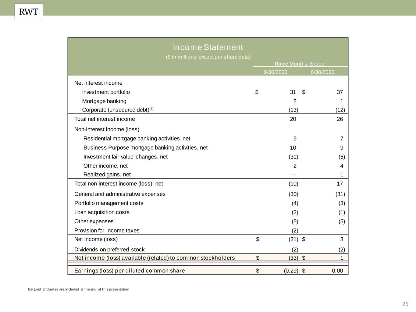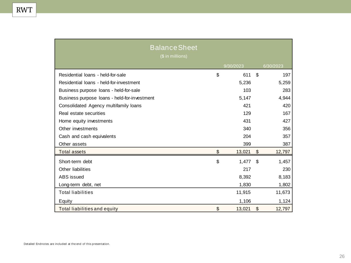 25 Detailed Endnotes are included at the end of this presentation. Income Statement ($ in millions, except per share data) Three Months Ended 9/30/2023 6/30/2023 Net interest income Investment portfolio $ 31 $ 37 Mortgage banking 2 1 Corporate (unsecured debt)(1) (13) (12) Total net interest income 20 26 Non-interest income (loss) Residential mortgage banking activities, net 9 7 Business Purpose mortgage banking activities, net 10 9 Investment fair value changes, net (31) (5) Other income, net 2 4 Realized gains, net — 1 Total non-interest income (loss), net (10) 17 General and administrative expenses (30) (31) Portfolio management costs (4) (3) Loan acquisition costs (2) (1) Other expenses (5) (5) Provision for income taxes (2) — Net income (loss) $ (31) $ 3 Dividends on preferred stock (2) (2) Net income (loss) available (related) to common stockholders $ (33) $ 1 Earnings (loss) per diluted common share $ (0.29) $ 0.00