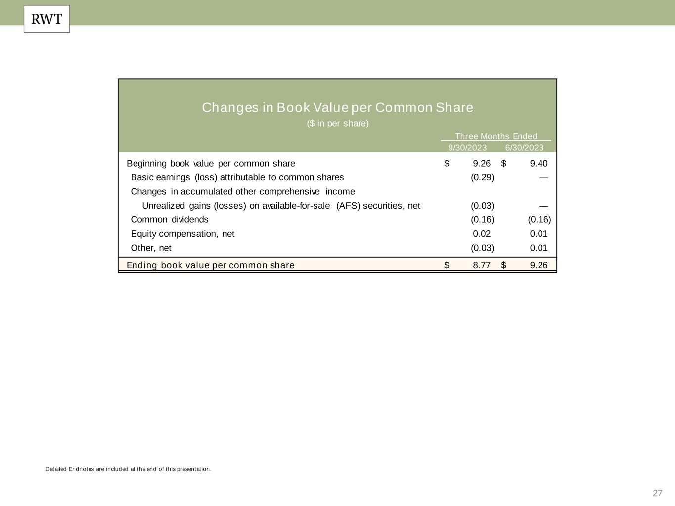 27 Detailed Endnotes are included at the end of this presentation. Changes in Book Value per Common Share ($ in per share) Three Months Ended 9/30/2023 6/30/2023 Beginning book value per common share $ 9.26 $ 9.40 Basic earnings (loss) attributable to common shares (0.29) — Changes in accumulated other comprehensive income Unrealized gains (losses) on available-for-sale (AFS) securities, net (0.03) — Common dividends (0.16) (0.16) Equity compensation, net 0.02 0.01 Other, net (0.03) 0.01 Ending book value per common share $ 8.77 $ 9.26